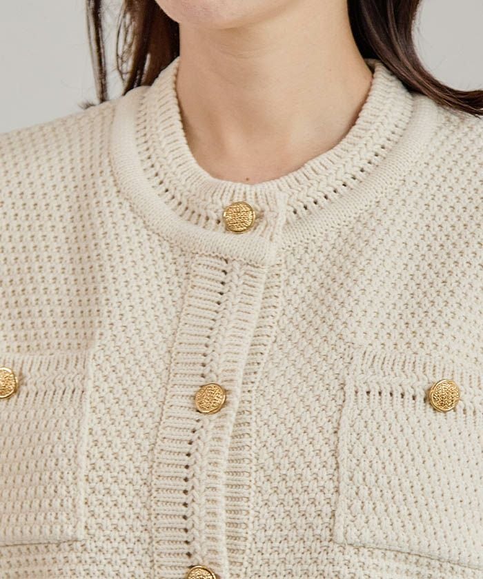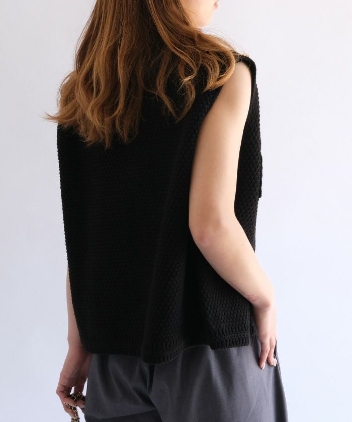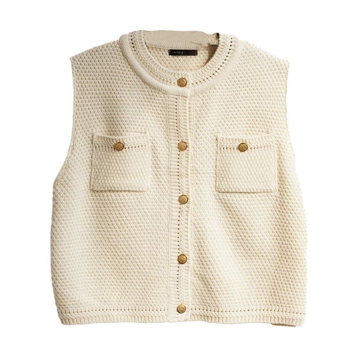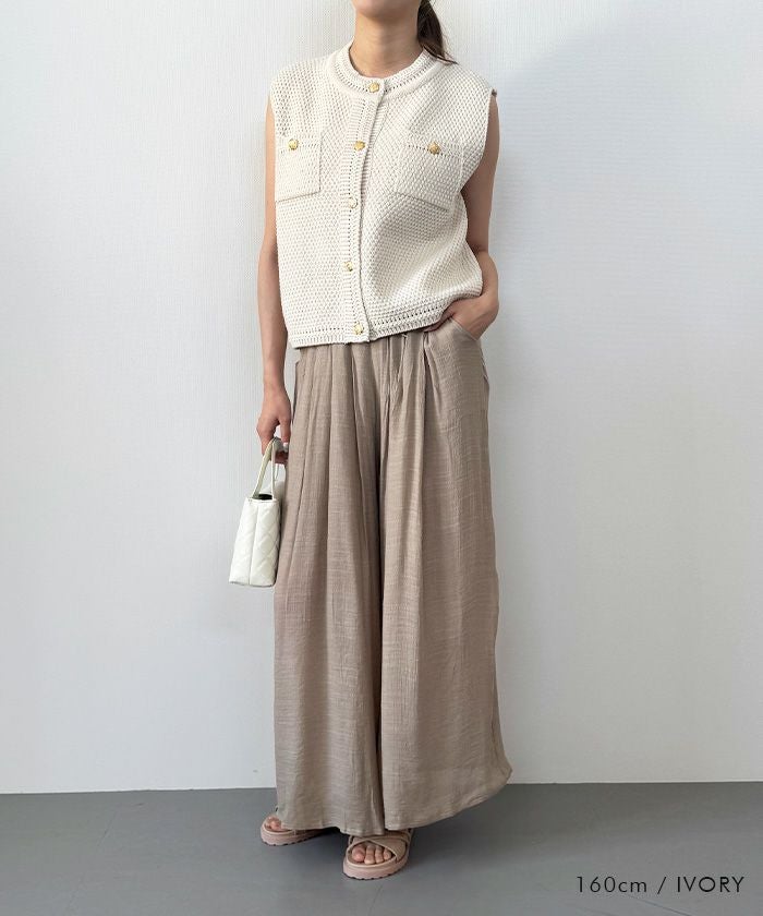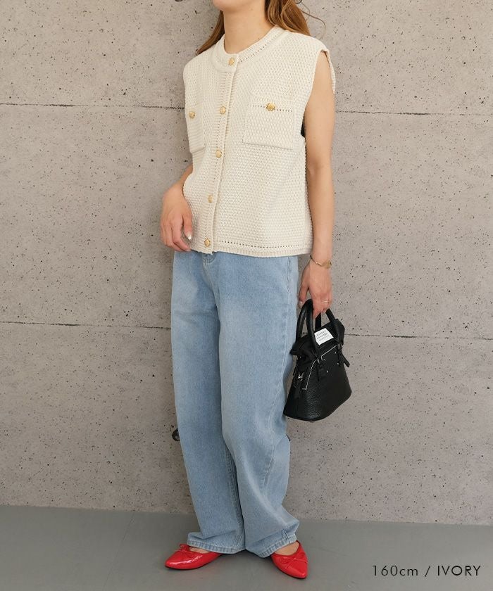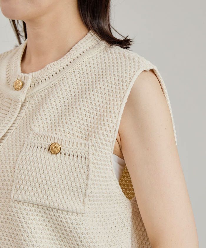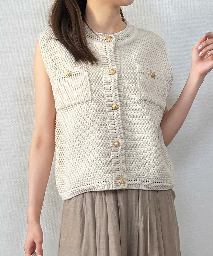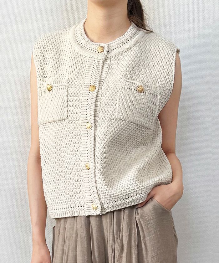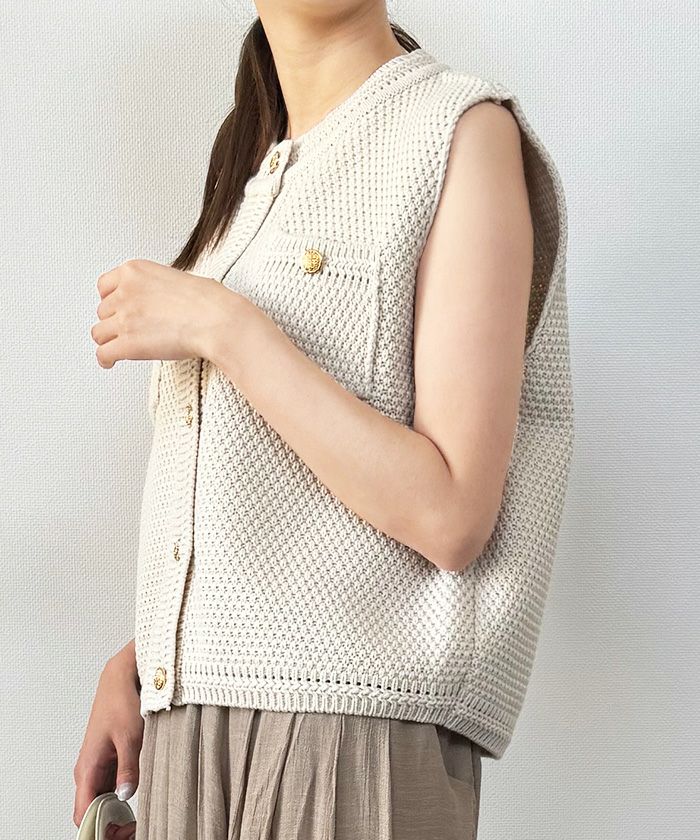 クラシカルな雰囲気をまとった、金ボタンが印象的なニットベスト。