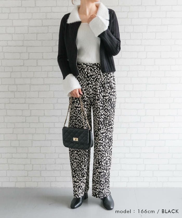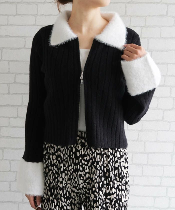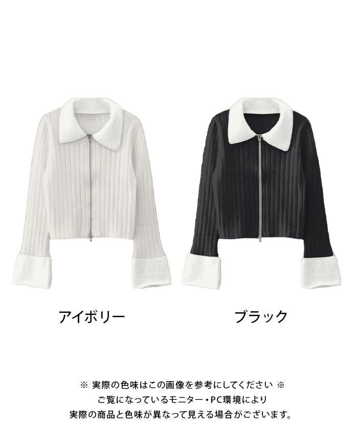 • フェザーヤーン素材を使用した襟付きのショート丈ダブルジップリブニットカーディガン