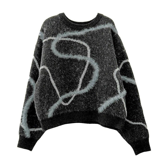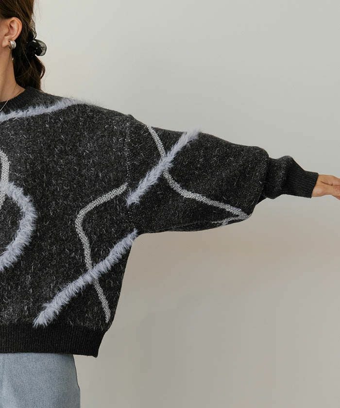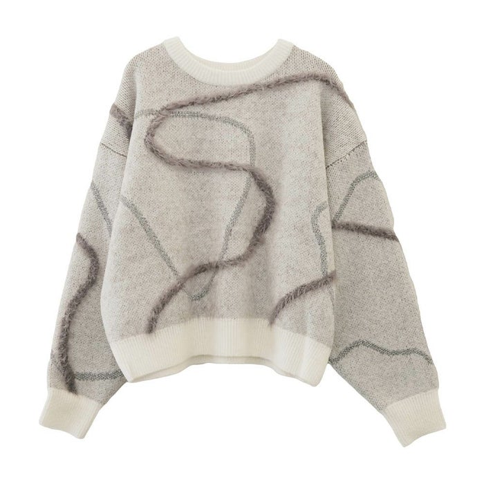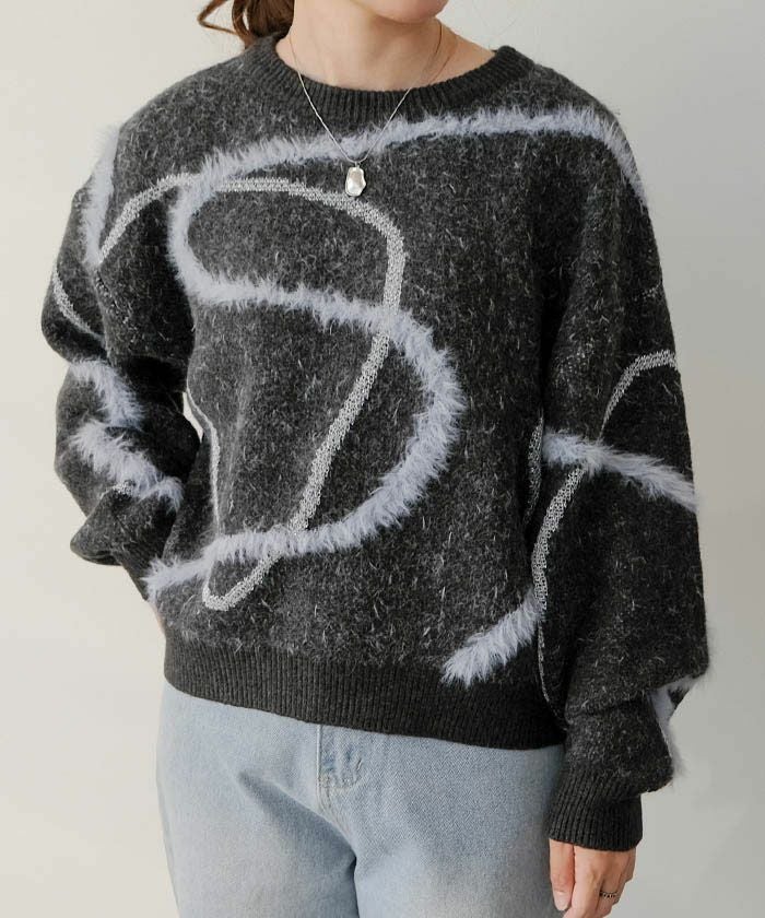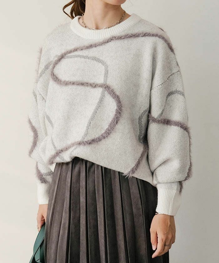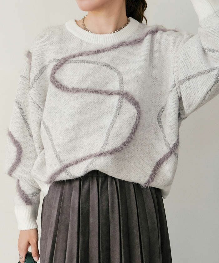ふんわりとした毛足が特徴のフェザータッチ素材に、きらりと輝くラメラインを組み合わせた、華やかさと優しさを兼ね備えたニットトップス。