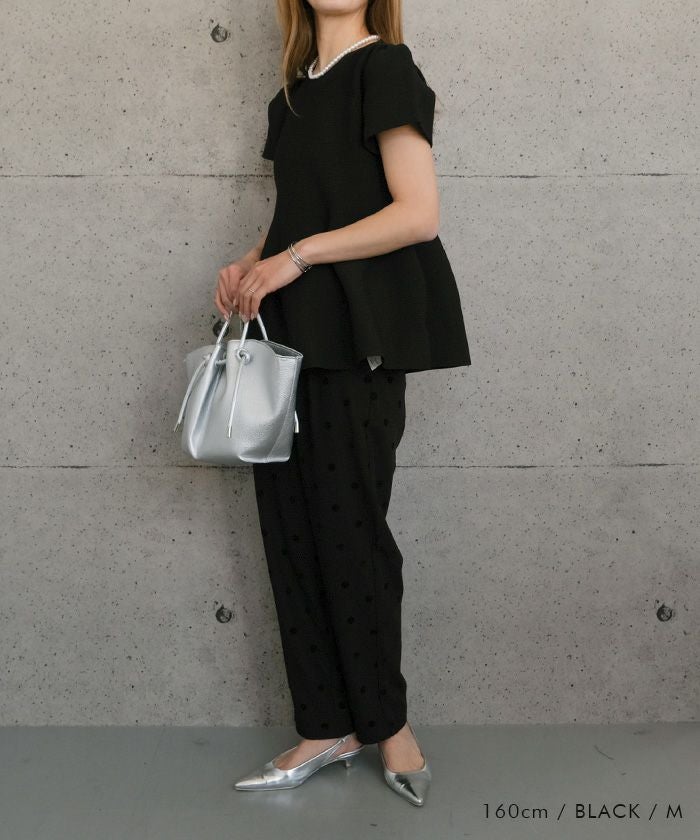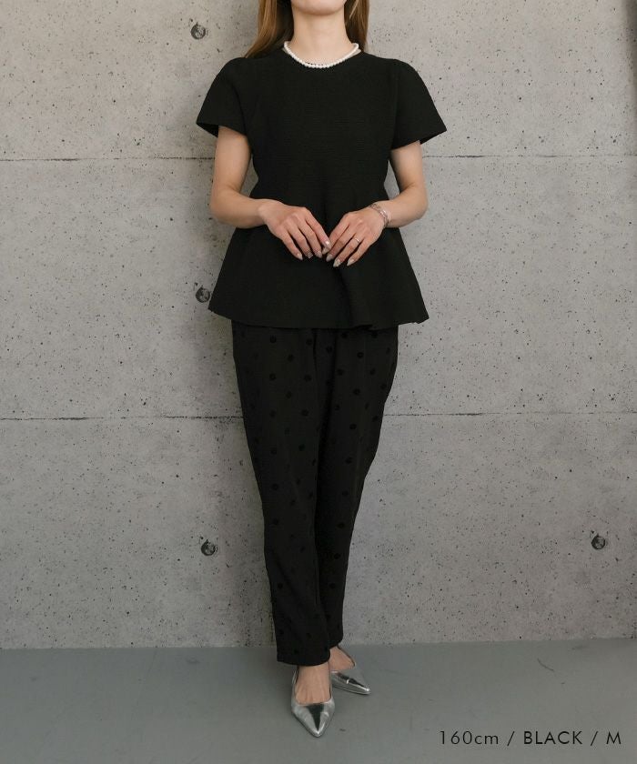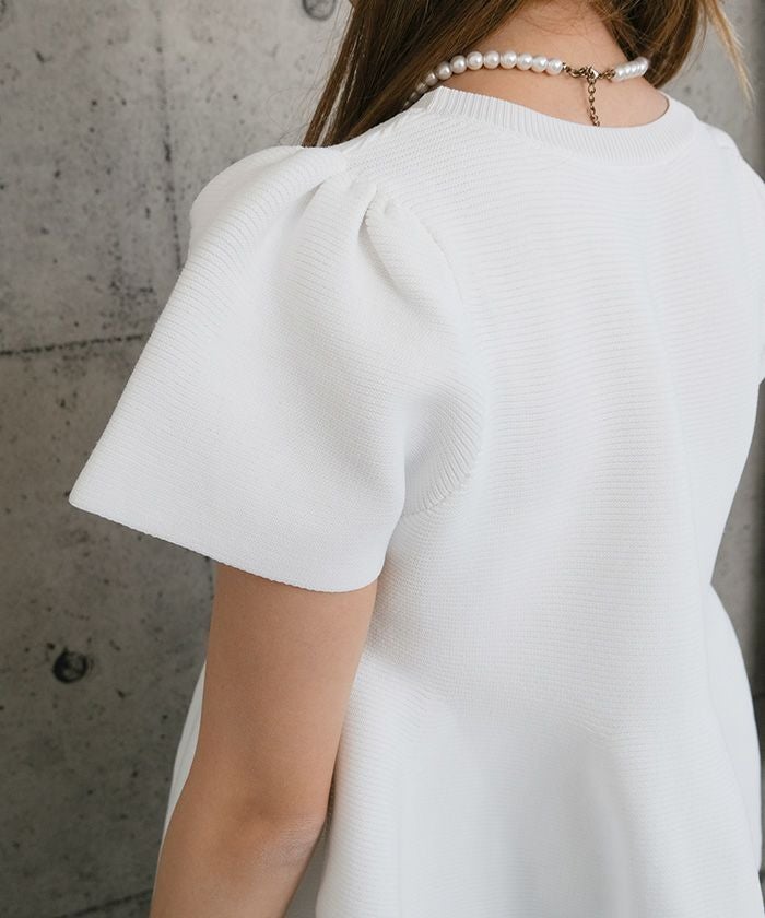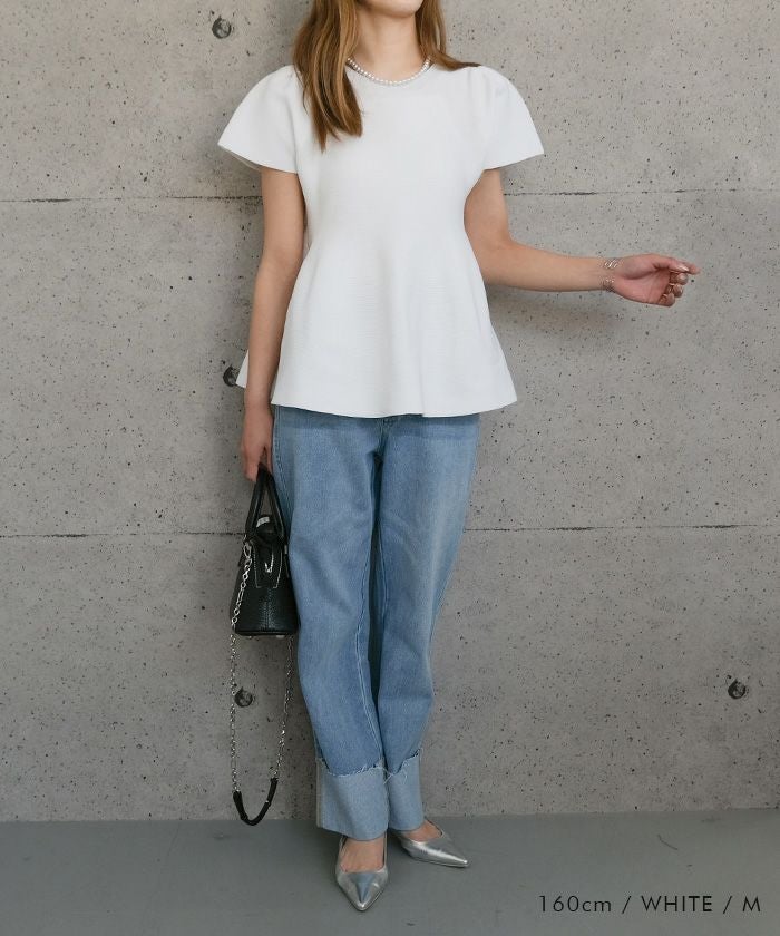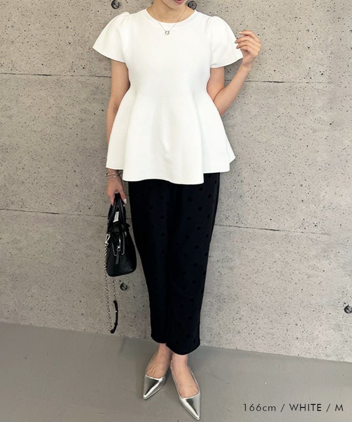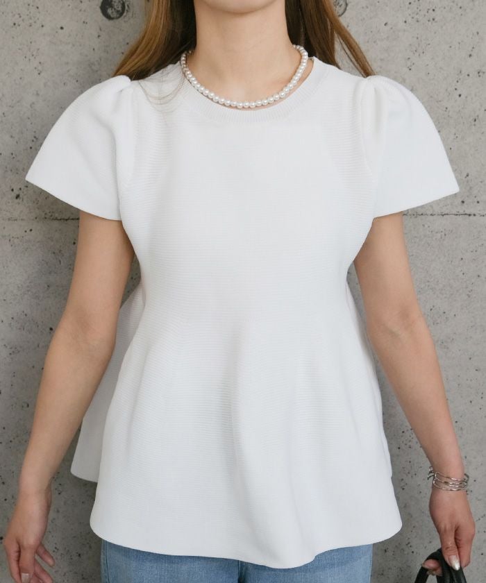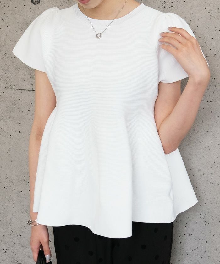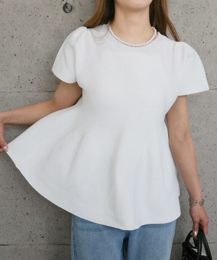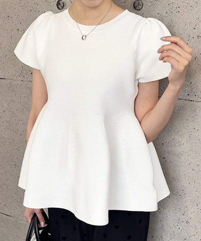 ウエスト部分から裾にかけてふんわりと広がるペプラムデザインが特徴のトップスです。