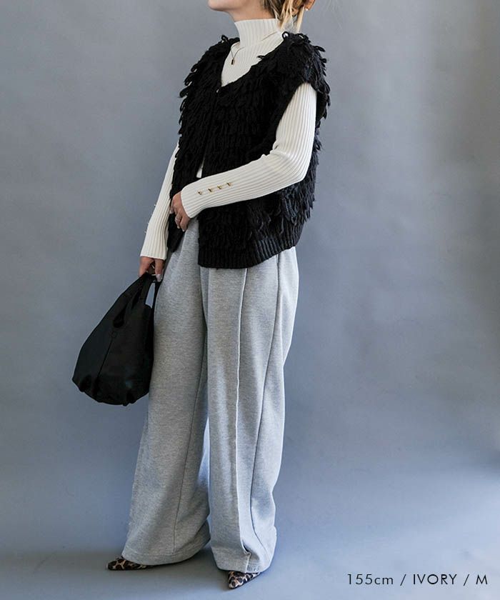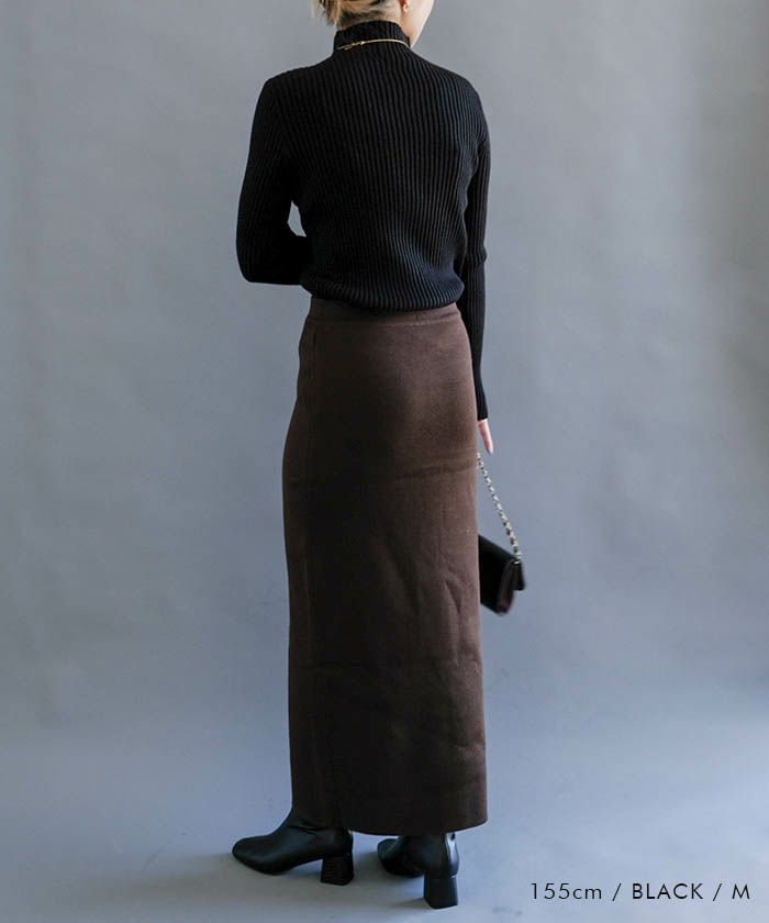 全体はすっきりとしたリブ編みで仕立てられ、女性らしいシルエットを自然に引き立ててくれます。