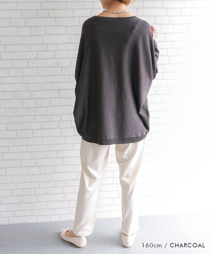ゆったりとしたシルエットと、肩のラインを落としたドルマンスリーブが魅力のニットトップス。