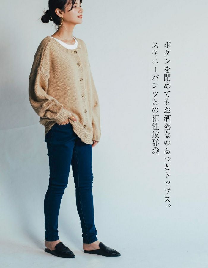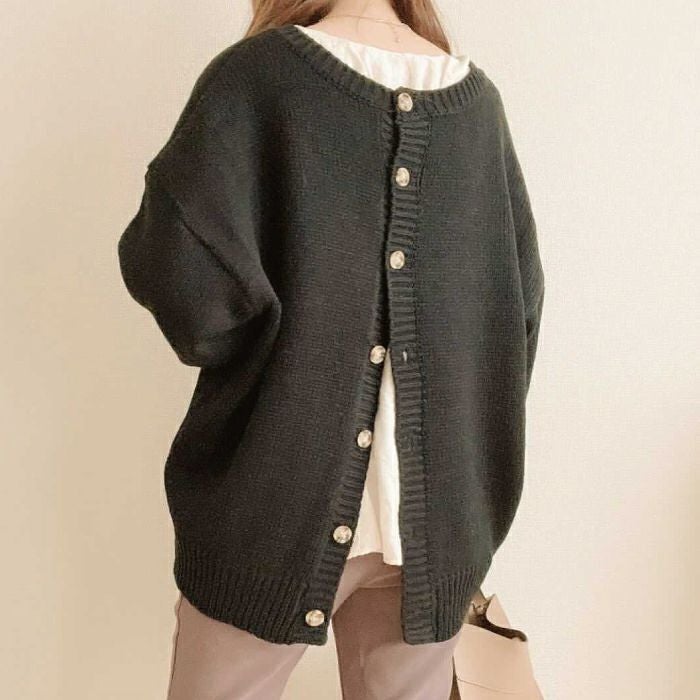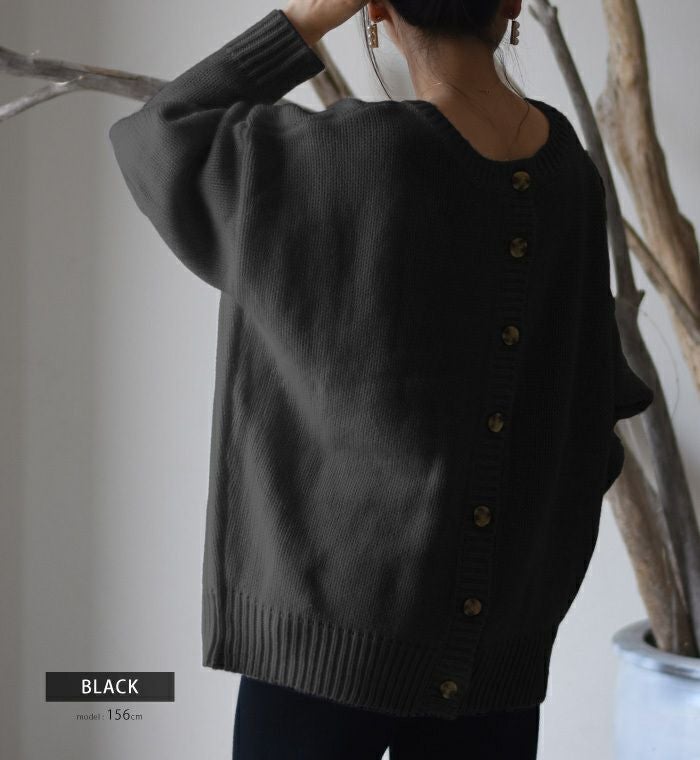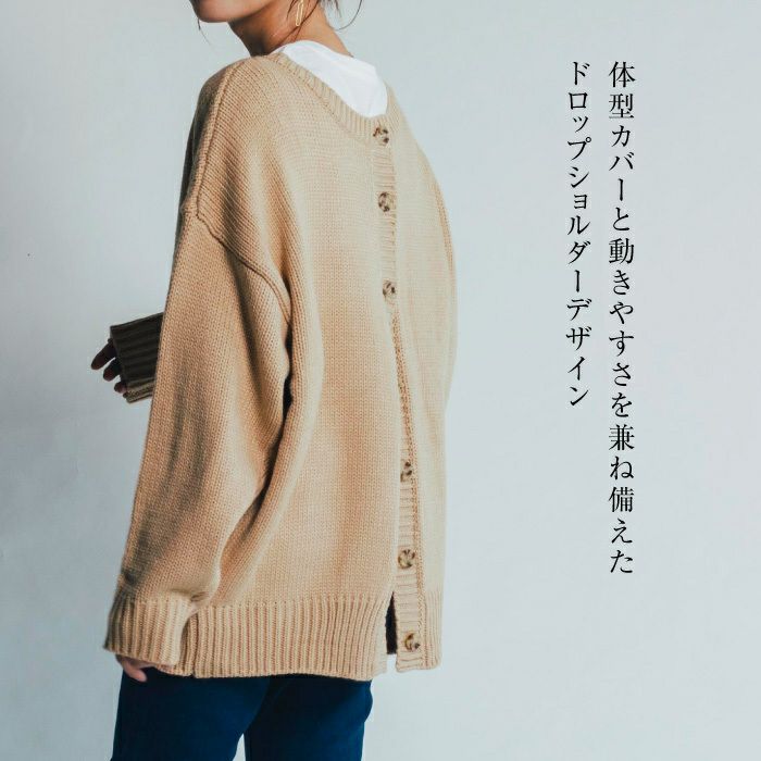 フロントボタンで着ればカーディガンに、バックボタンにすれば可愛いバックボタントップスとして着回せます。またバックボタンを開けてインナーを覗かせれば、背中でのさりげないレイヤード風の着こなしが完成します。