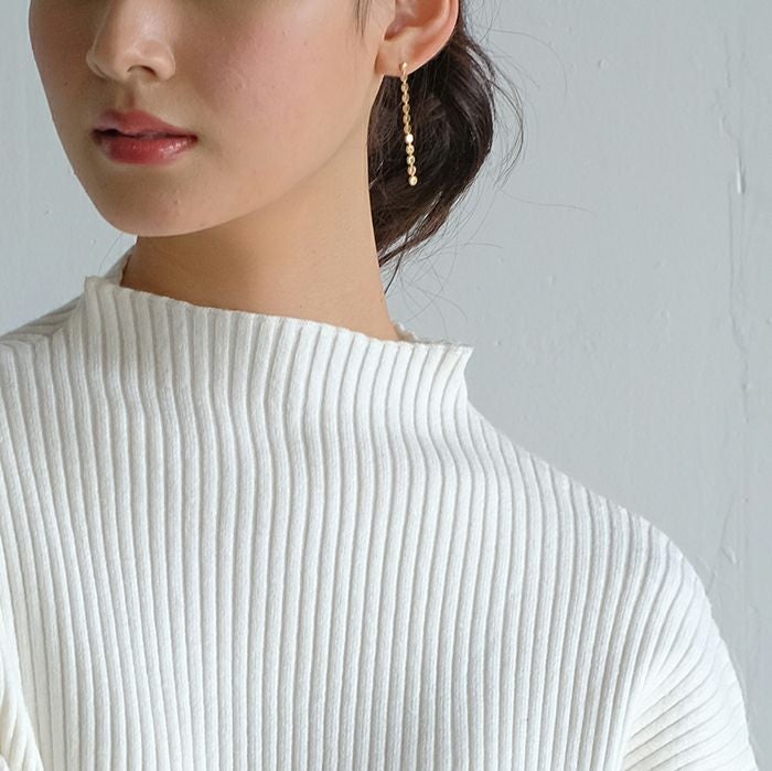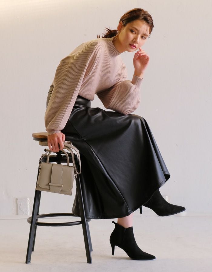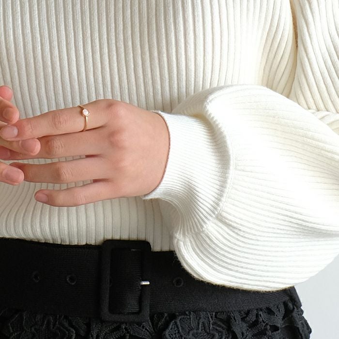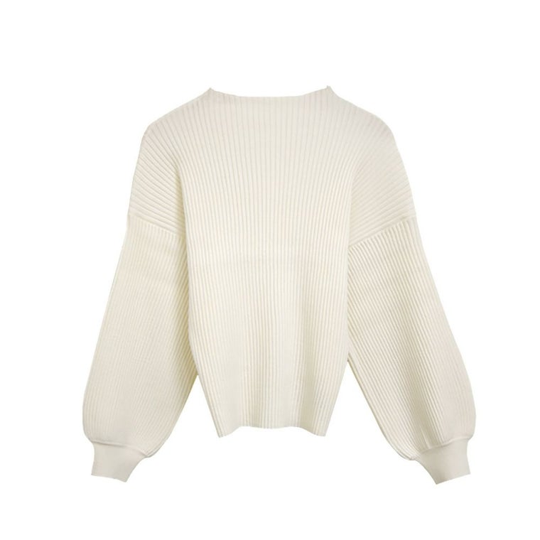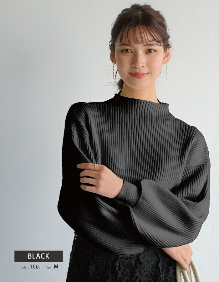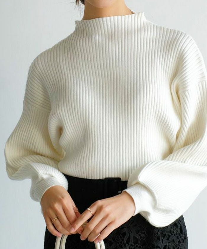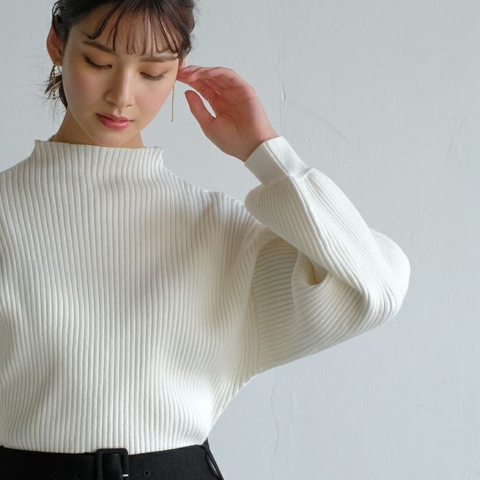 • ふんわり柔らかい長袖ニットトップス。ぽわんとしたボリューム袖とほっそりとした華奢見せ袖口のシルエットで女性らしさを演出。