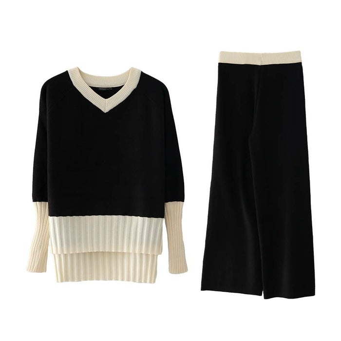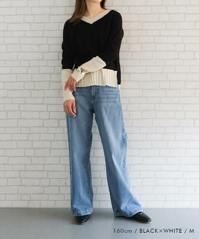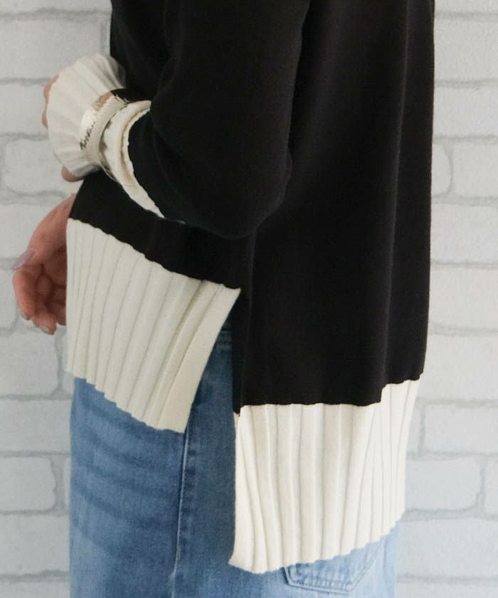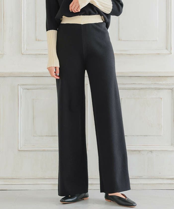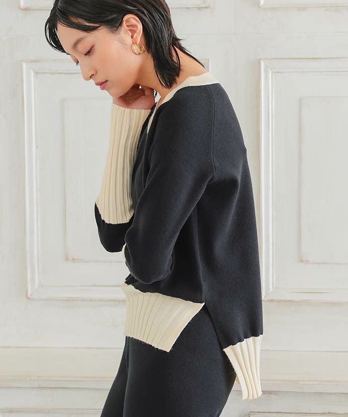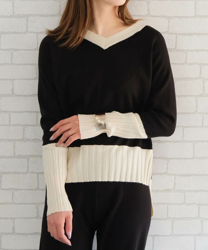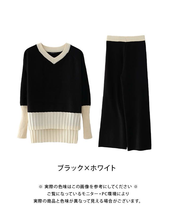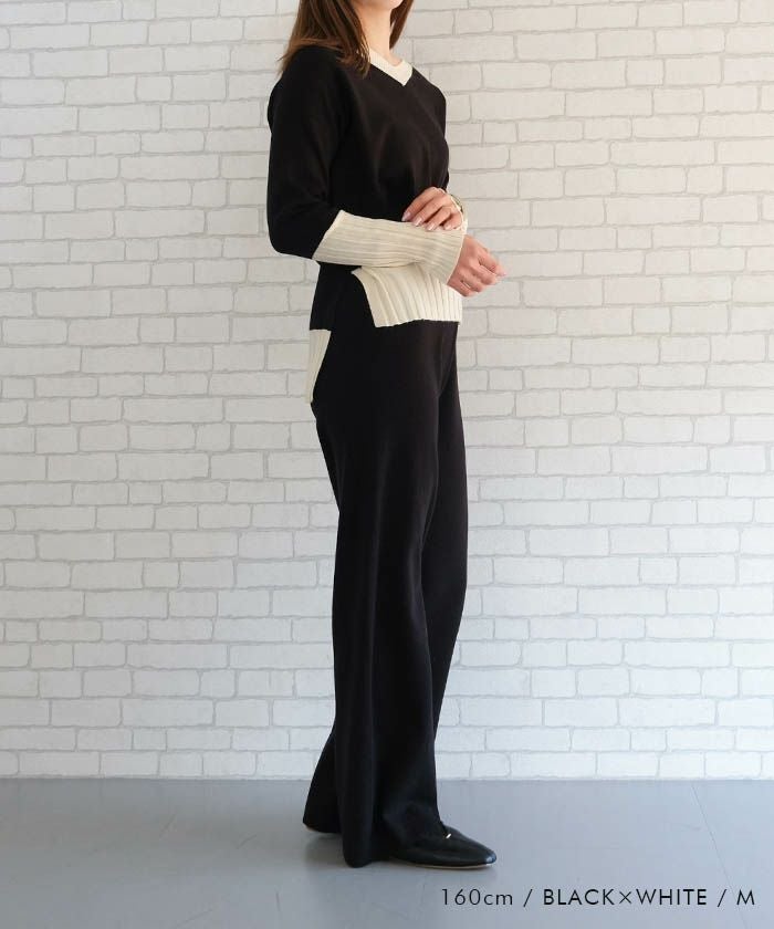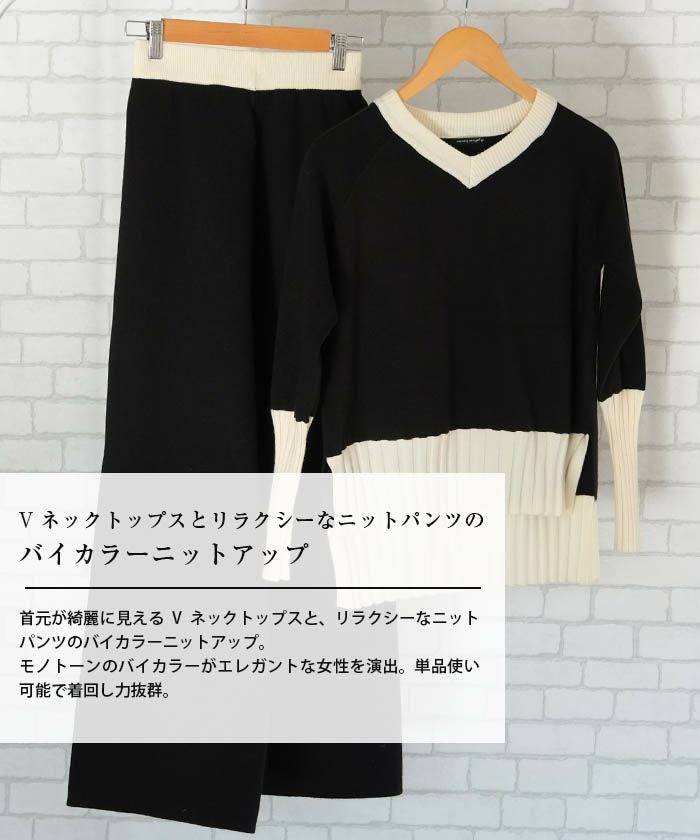 • 首元が綺麗に見えるVネックトップスと、リラクシーなニットパンツのバイカラーニットアップ。