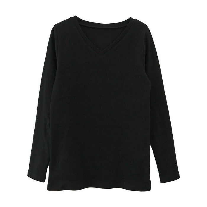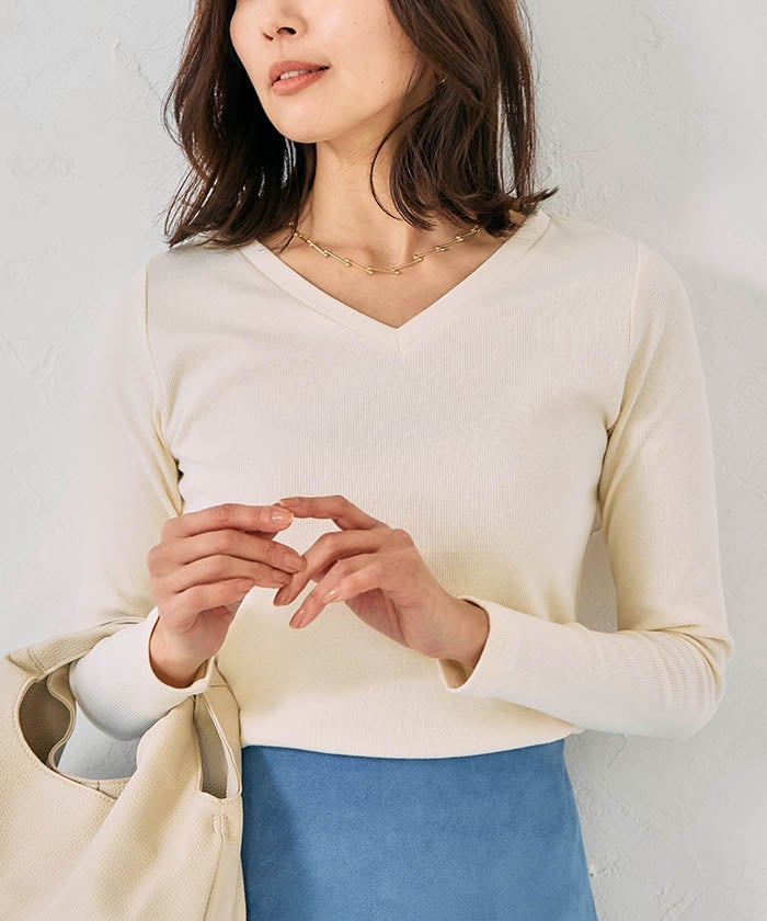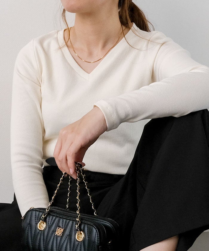 Vネックはフェイスラインをすっきり見せるシャープなスタイルに、