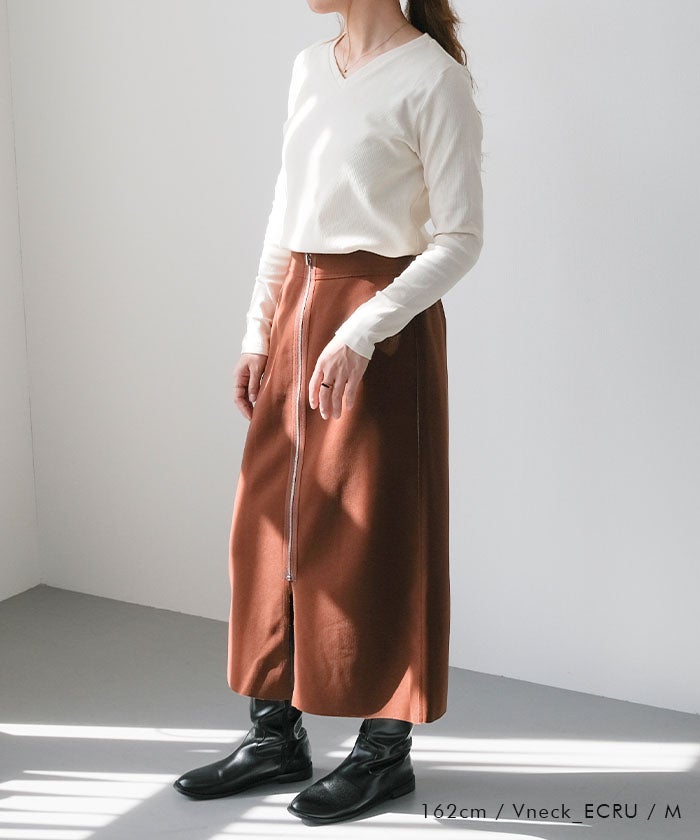 Vネックはジャケットやカーディガンのインナーに合わせてきれいめに。