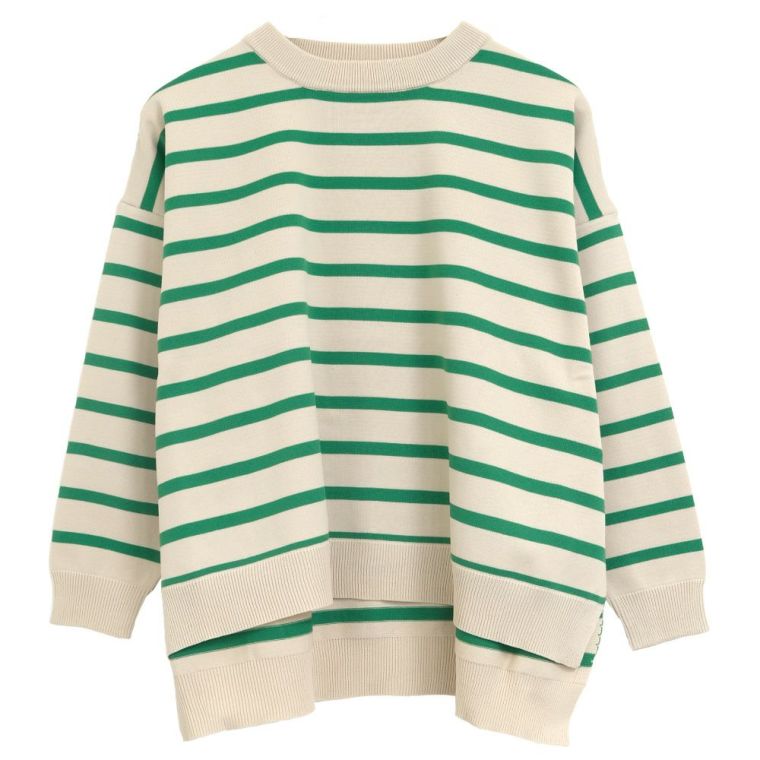 ゆったりとしたシルエットでこなれ感のあるニットトップス。 さらっとした素材感で初秋は1枚で着用してもお洒落に! サイドスリット入りで抜け感がありボトムを選ばず着られます。 前だけインしたり、アウトで着用しても決まるデザインです。