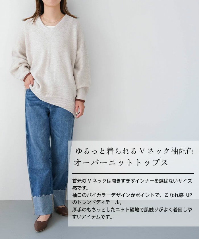 • 袖口の配色アクセントが可愛い、ゆるっと着られるVネック袖配色オーバーニットトップス