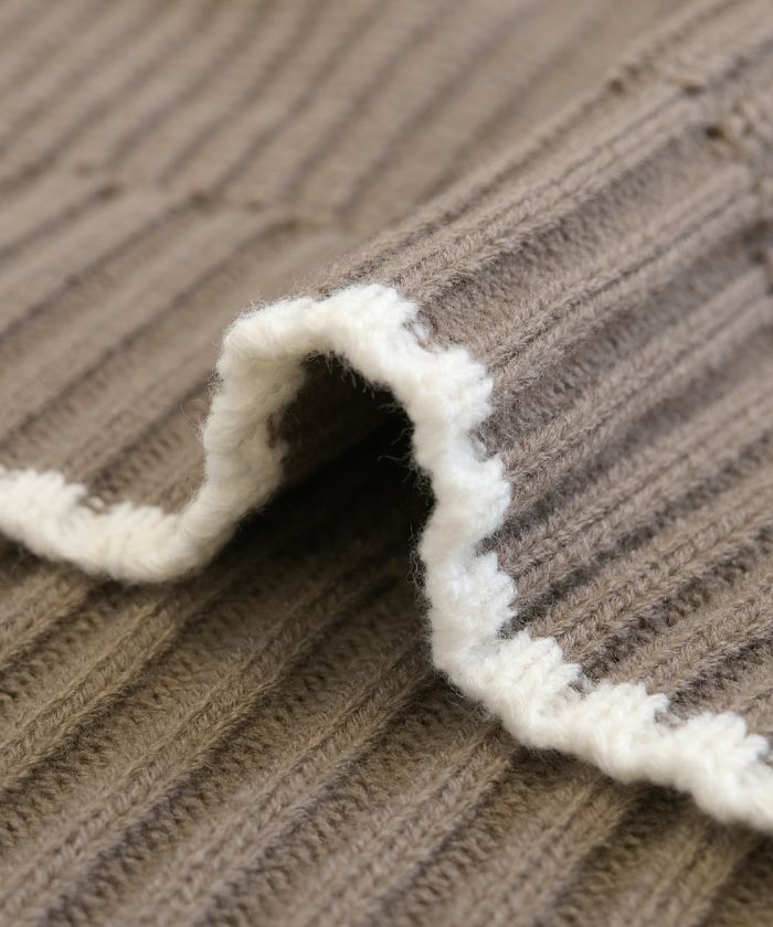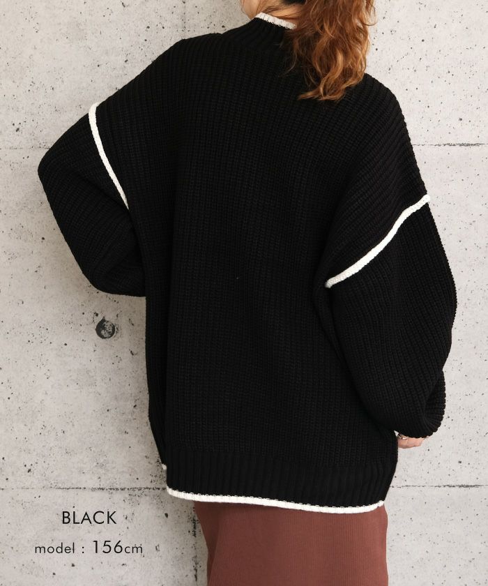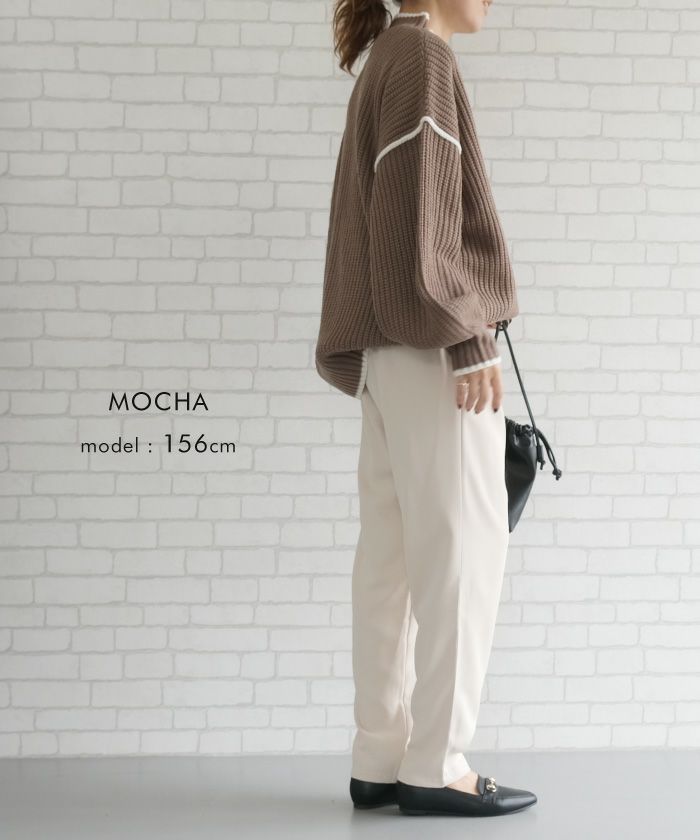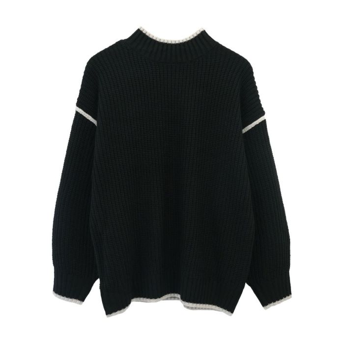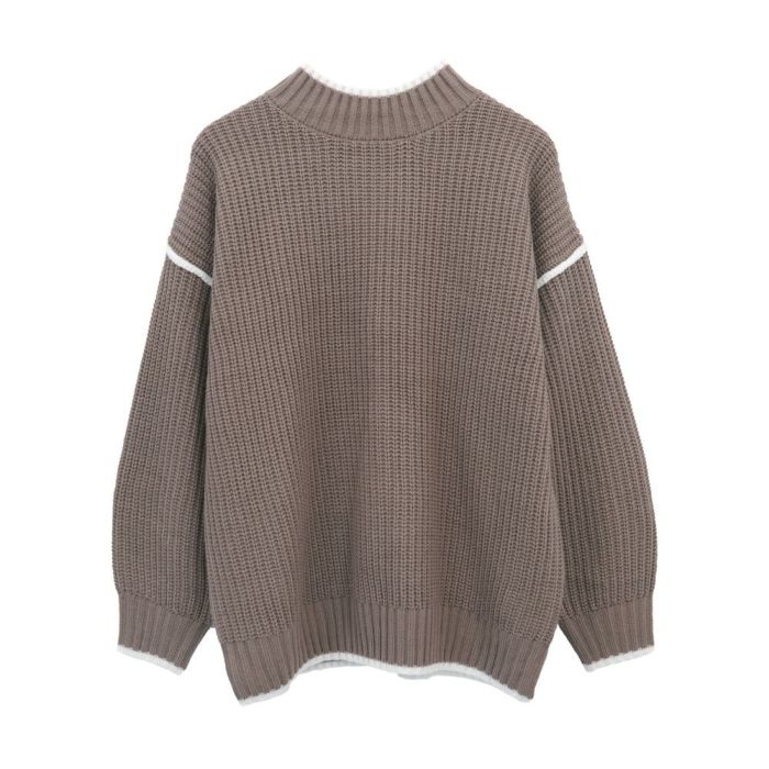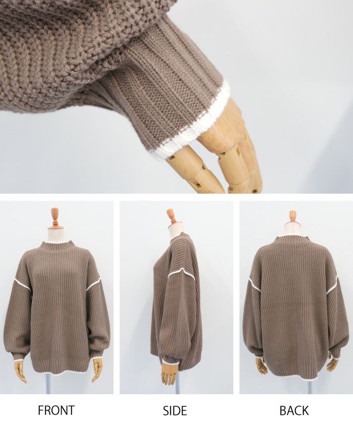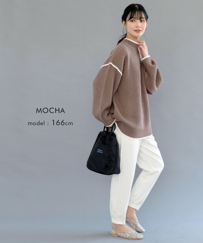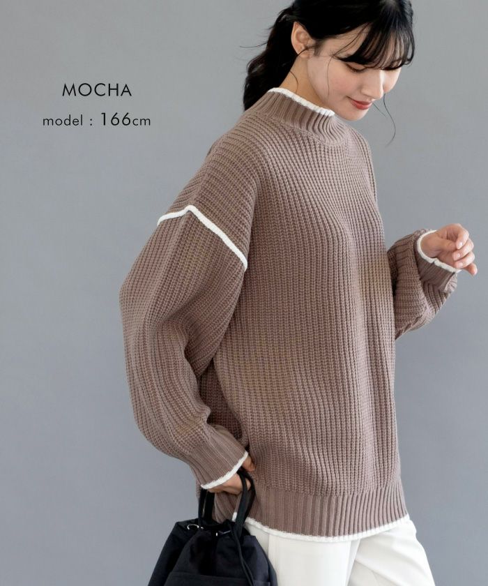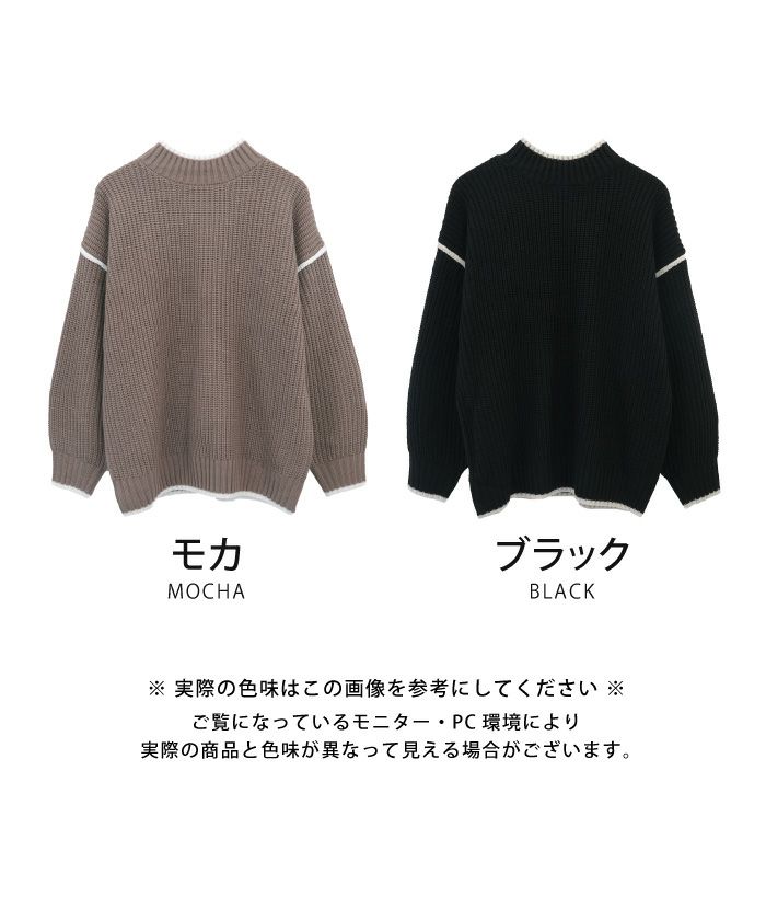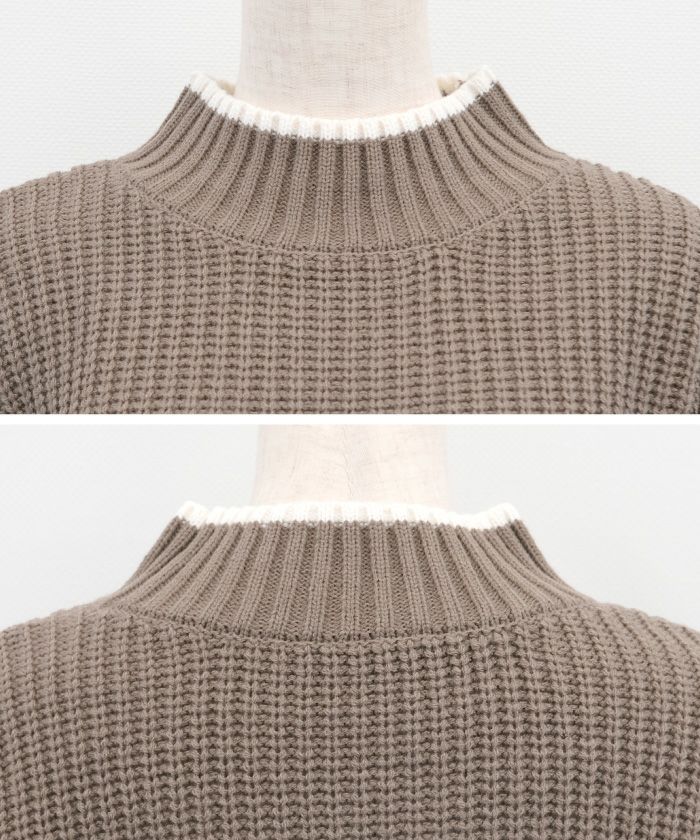 • バイカラーデザインが目を惹くモックネックニットトップス