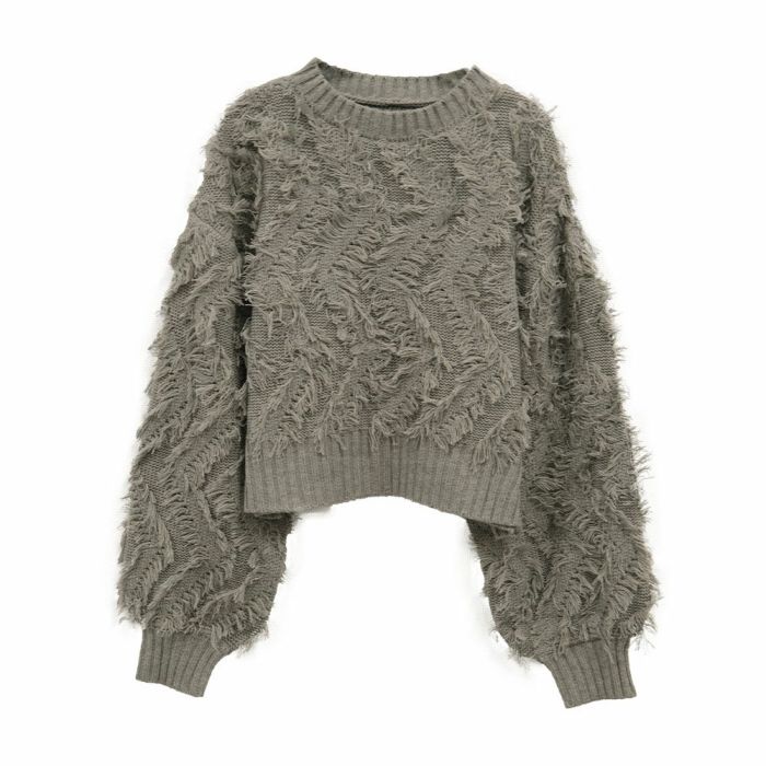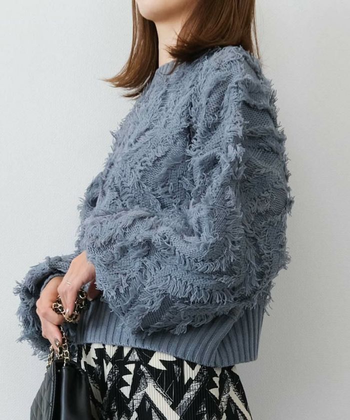 • 表情豊かなフリンジデザインが目を引くジャガードショート丈ニットトップス