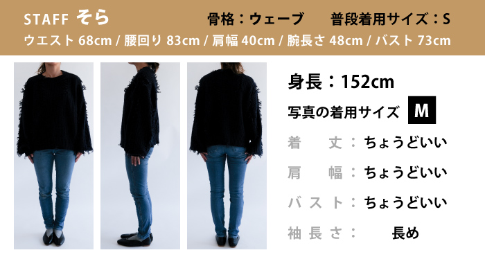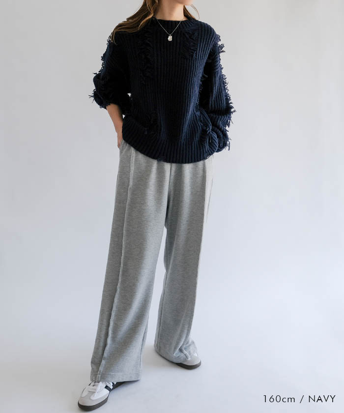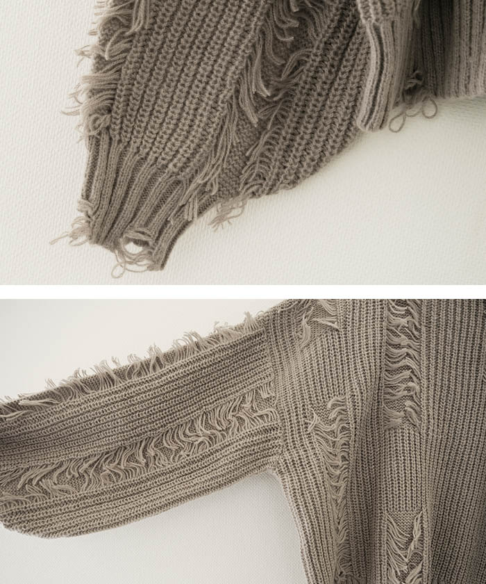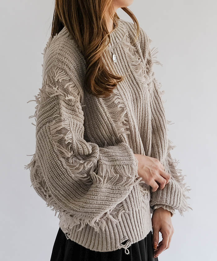 シンプルなニットに、遊び心のあるダメージ加工とフリンジディテールをプラスした、大人のカジュアルスタイルにぴったりの一枚です。