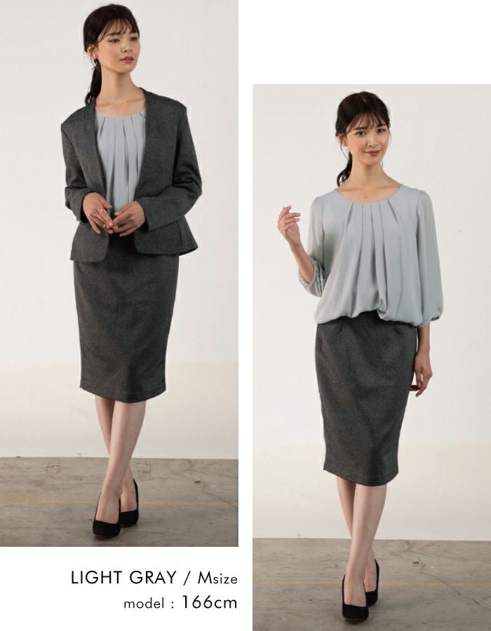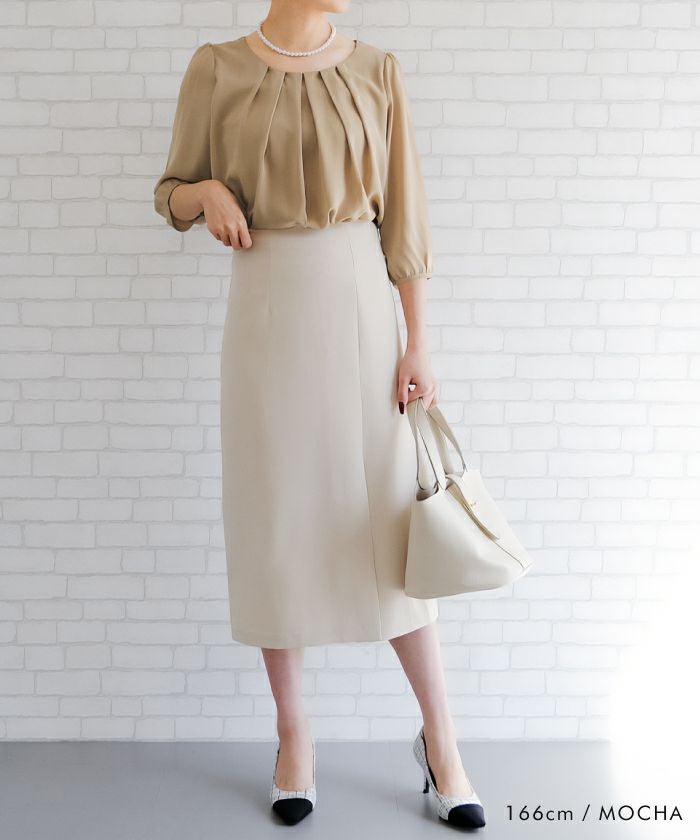 フロントのタックが縦ラインを強調し、着るだけでスッキリ見えを叶えます。