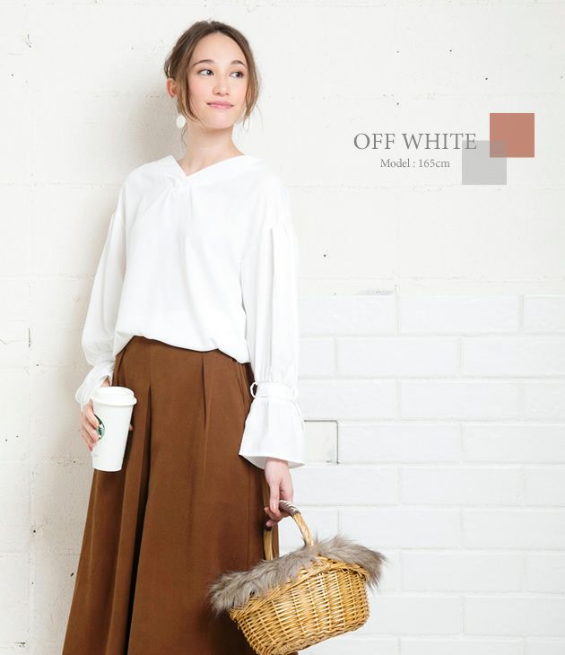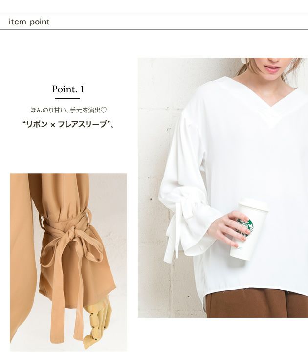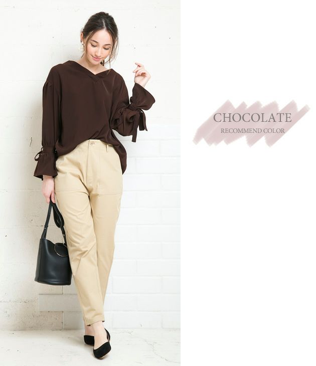 • ふんわりスリーブをキュッと絞ったリボンが、大人フェミニンなVネックブラウス。