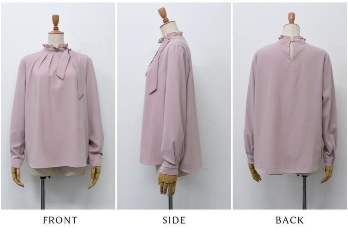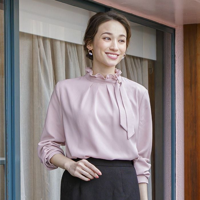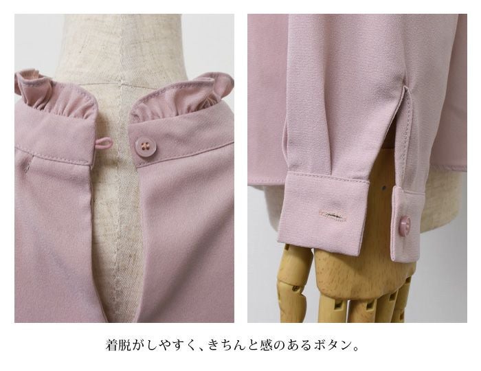 顔まわりを華やかに見せるフリルスタンドカラーが魅力のブラウス。