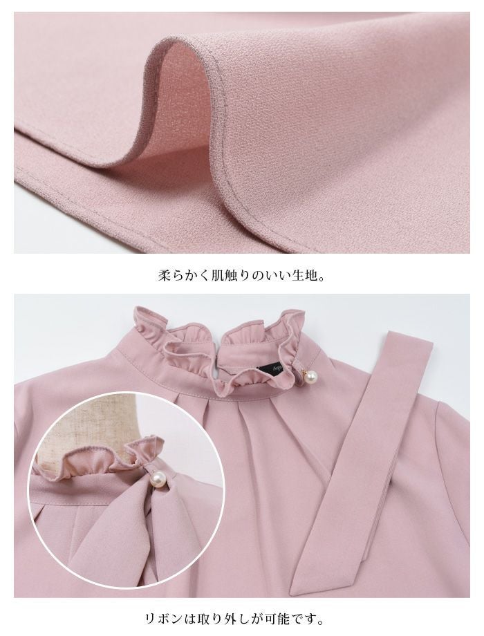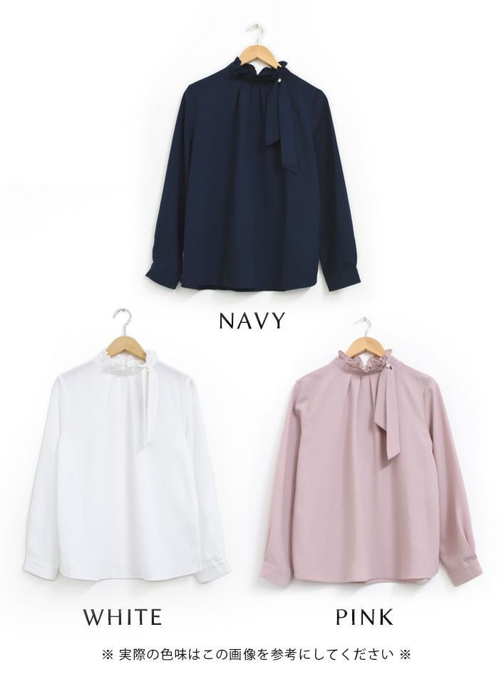 ブラウス トップス シャツ レディース プチハイネック スタンドカラー 立ち襟 立ち衿 フリルスタンドカラー リボン 春 秋 長袖 M L 二の腕カバー シンプル ベーシック きれいめ フォーマル セレモニー フェミニン ビジネス オフィスウェア オフィスカジュアル 通勤 上品 清楚 入園式 卒園式 入学式 卒業式 薄手 パール 白シャツ OL 20_01wrbl 20_02wrbl