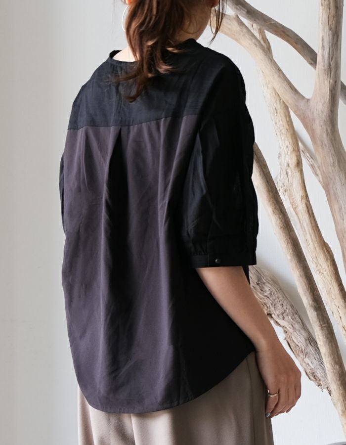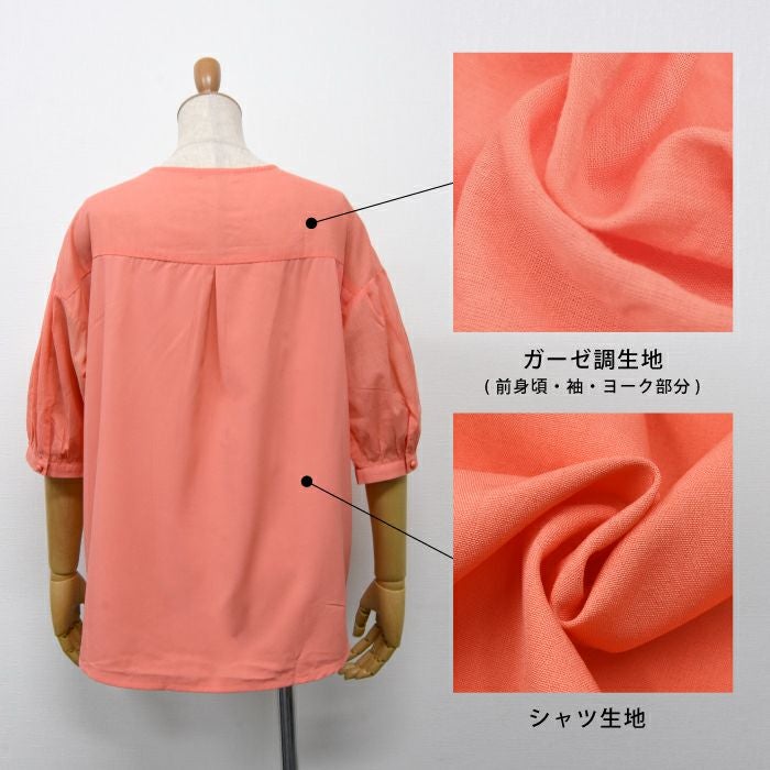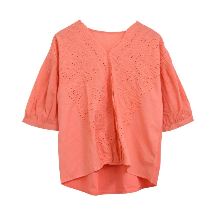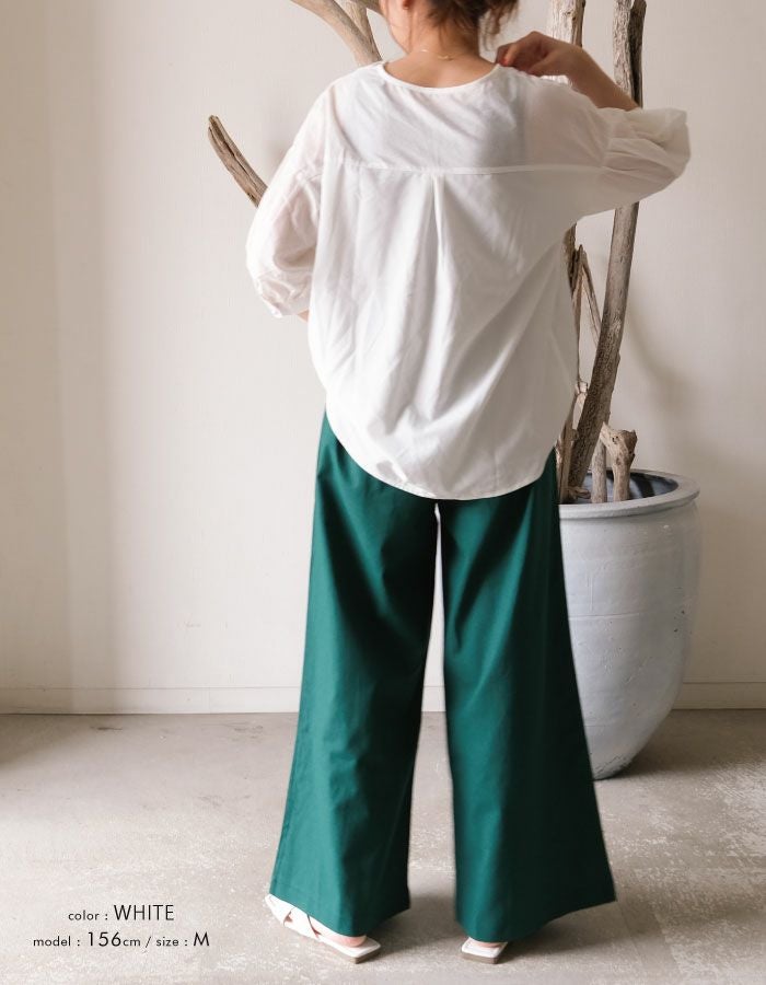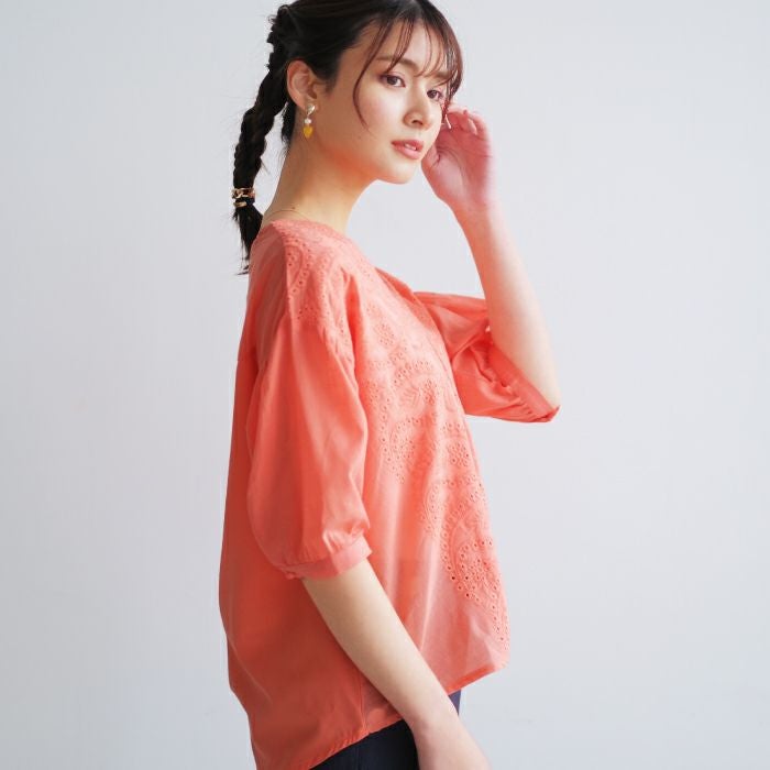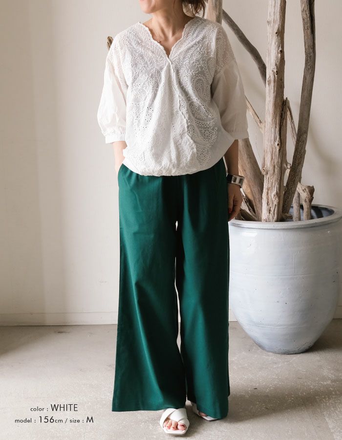 カシュクール風のスカラップ刺繍のネックが華やかなブラウス。 裾はギャザーを寄せて、ボトムスとのバランスが取りやすい仕様に。 お袖はふんわりさせ、5分袖で軽やかな印象に仕上げました。