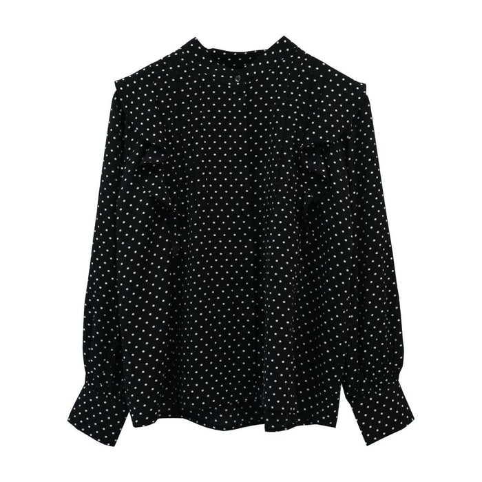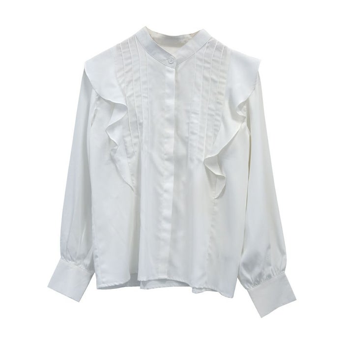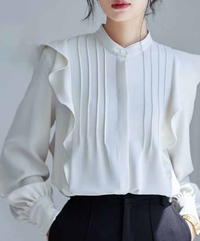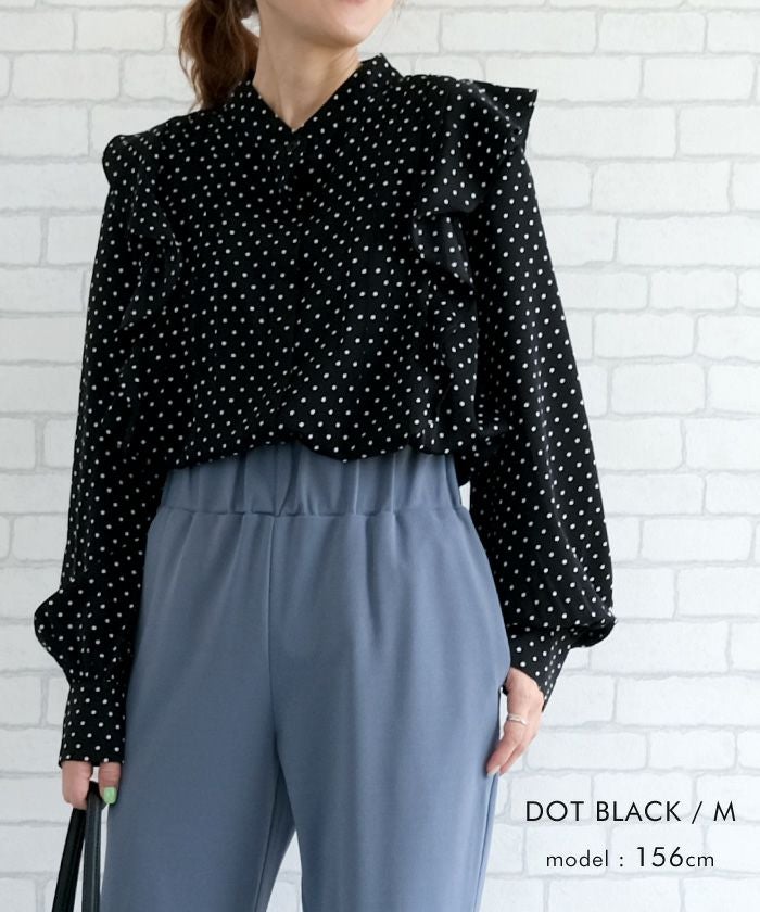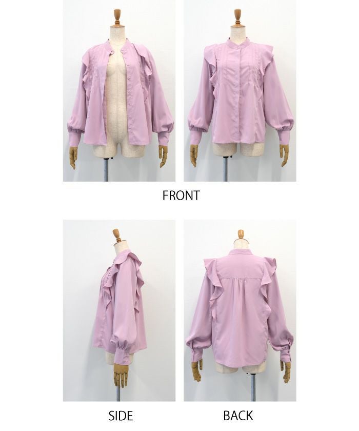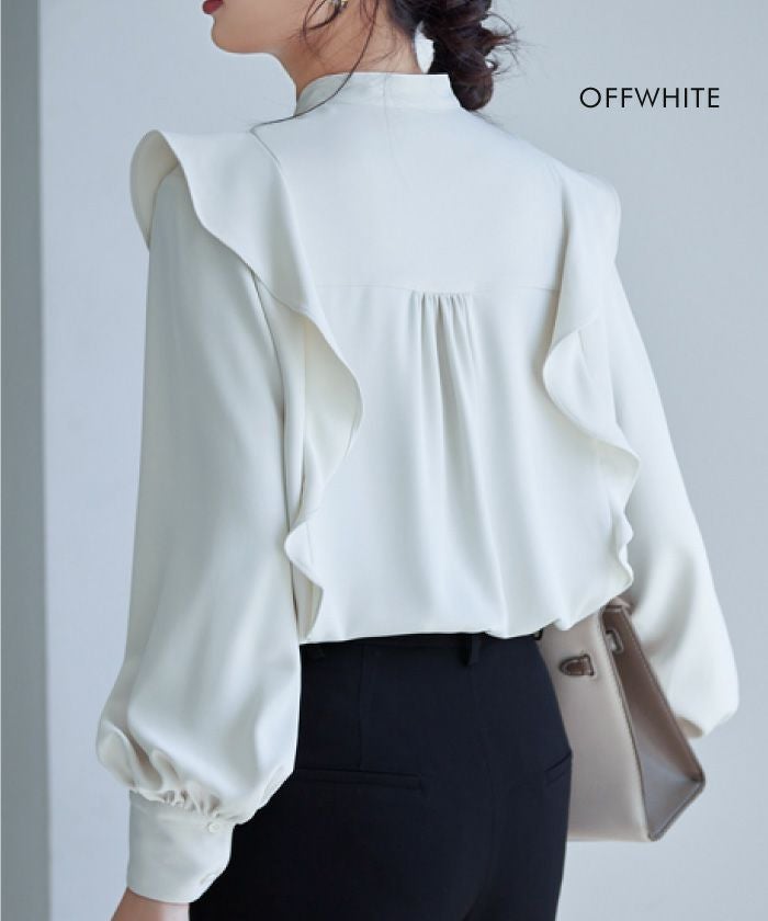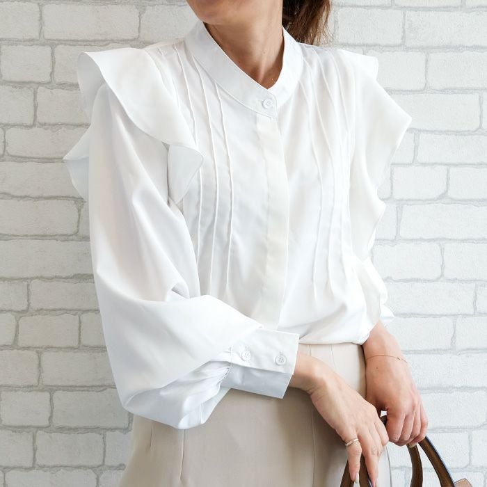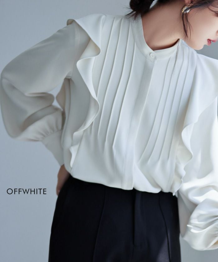 • 女性らしい華やかな雰囲気を演出!タックフリルバンドカラーブラウス