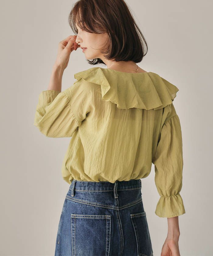 ふんわりとしたラッフルフリル襟が目を引く、2way仕様のブラウス。