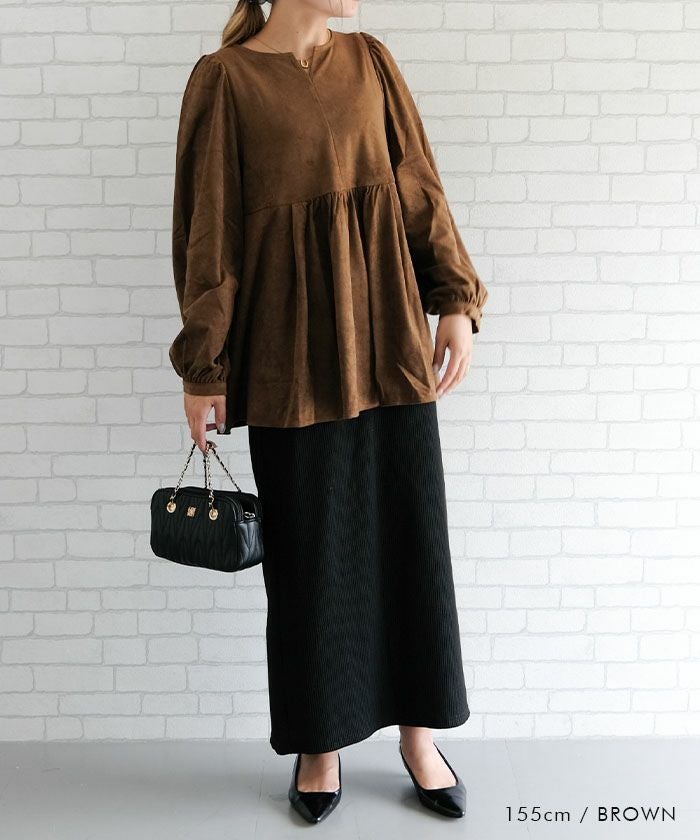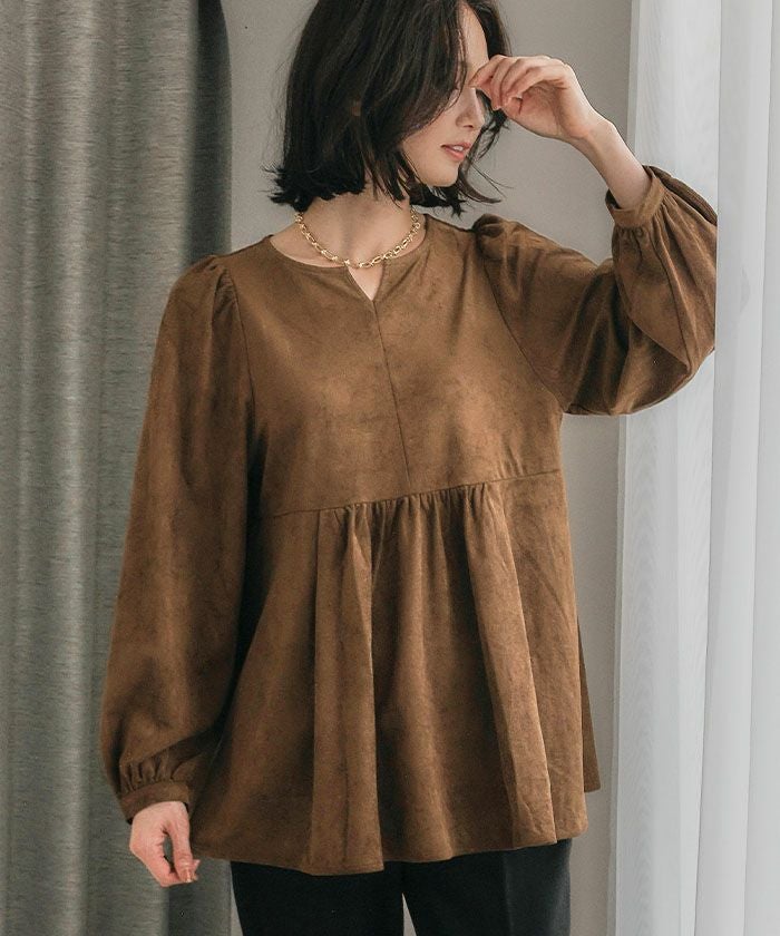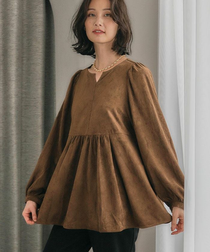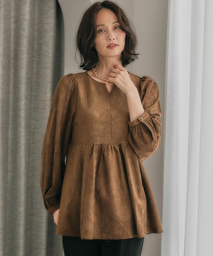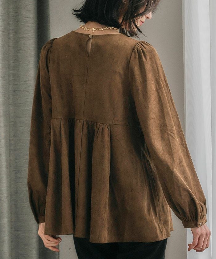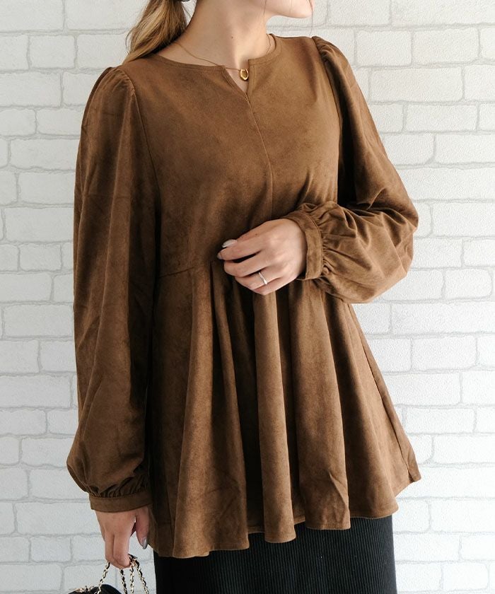 上品な大人の女性らしさを引き立てる、スエード調のペプラムトップス。