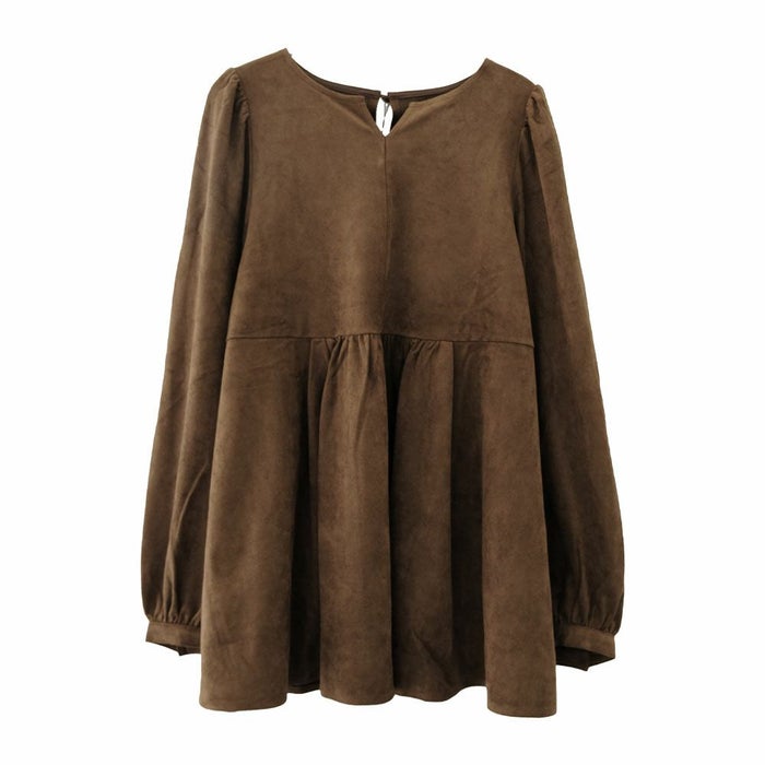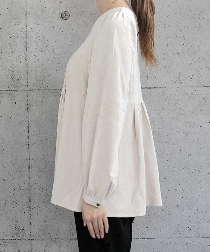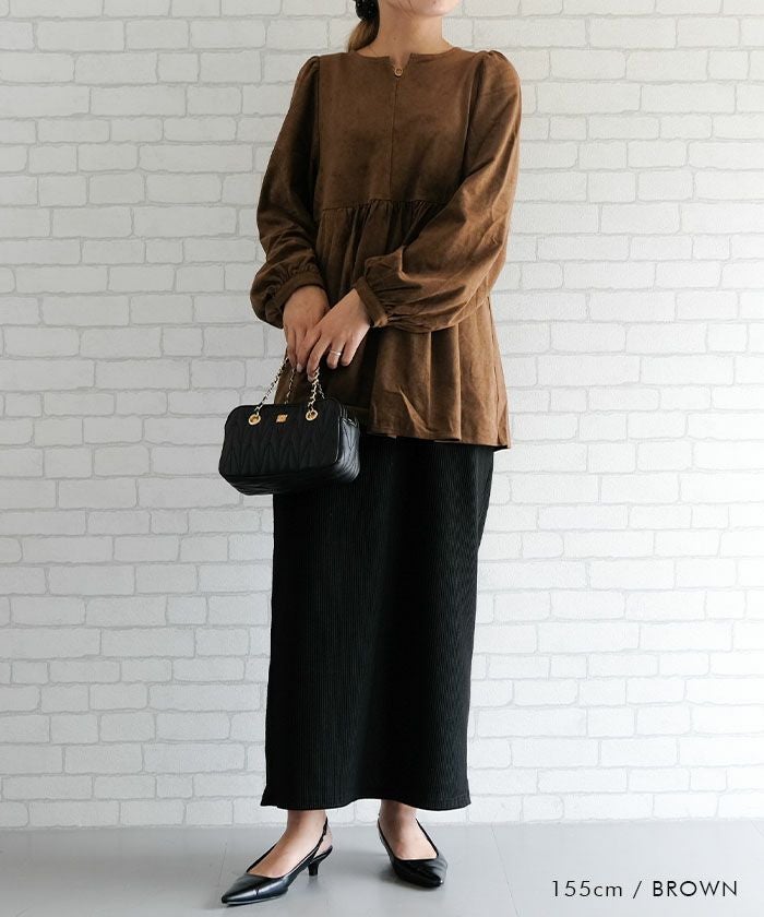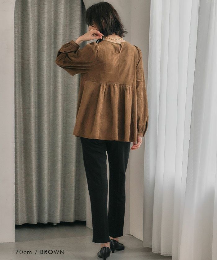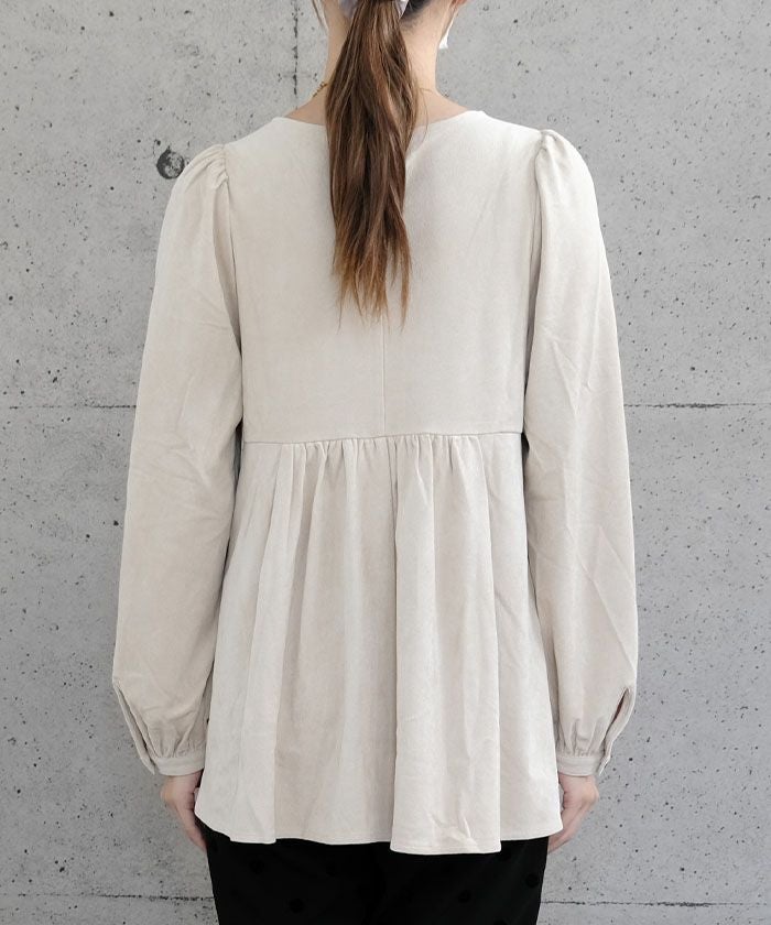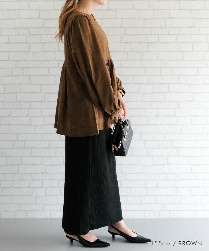 上品な大人の女性らしさを引き立てる、スエード調のペプラムトップス。
