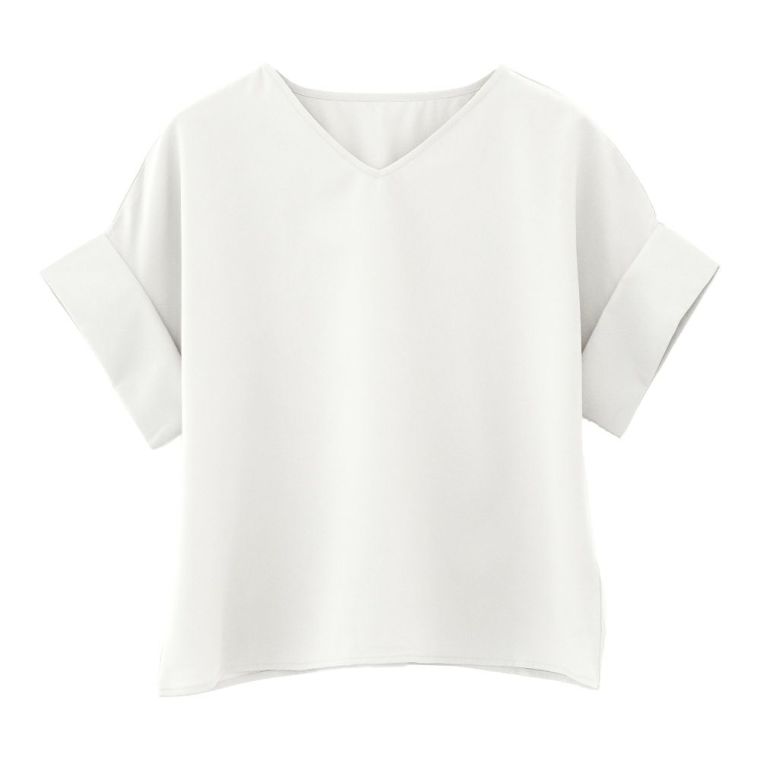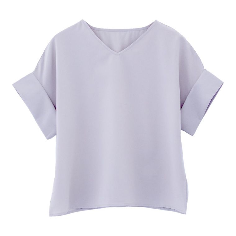 顔まわりをすっきり見せるVネックと、上品な五分袖デザイン。