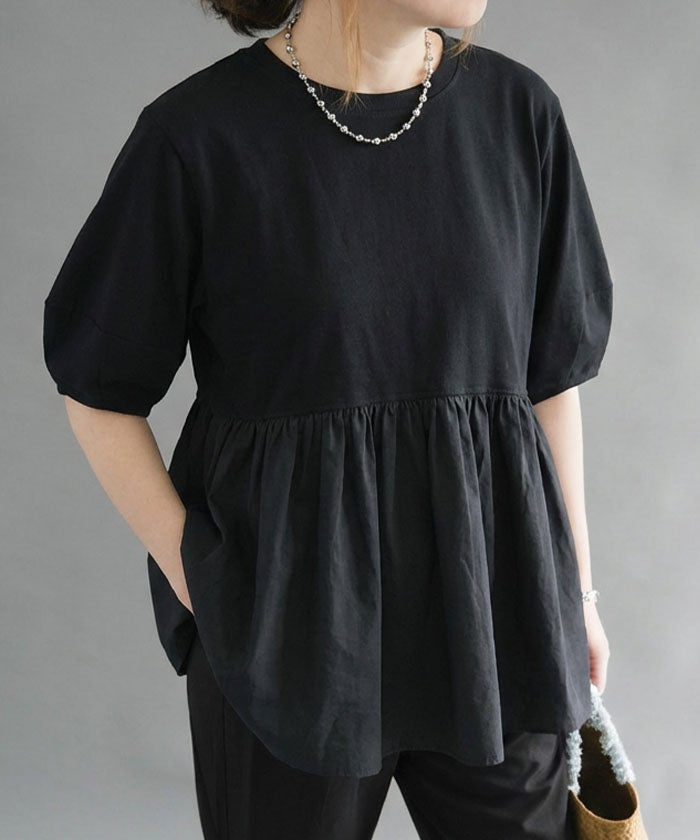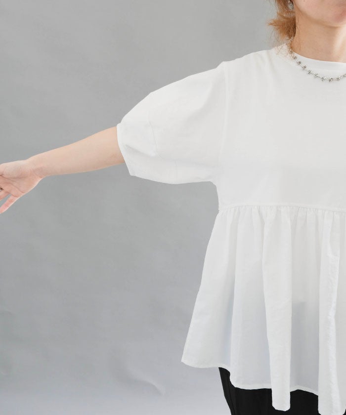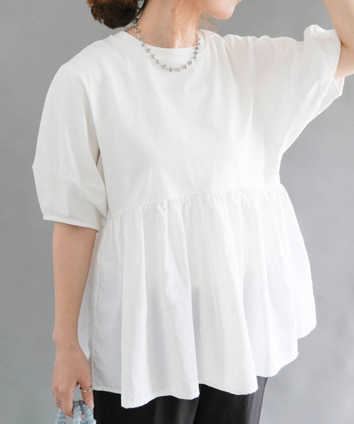身頃と裾部分で異なる素材を組み合わせた、表情豊かなペプラムトップスです。