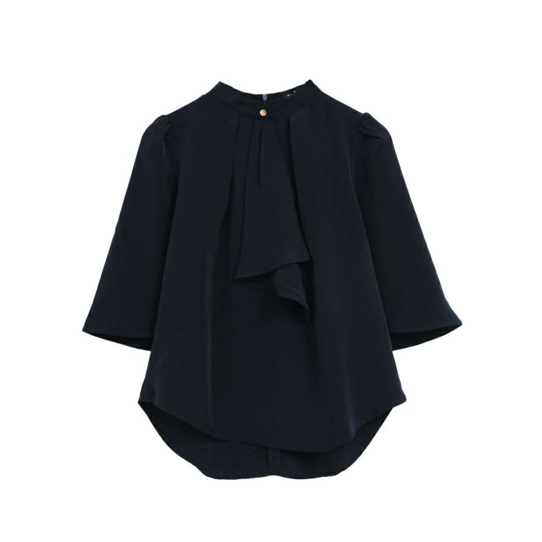 顔まわりを華やかに彩るスカーフタイ付きブラウス。