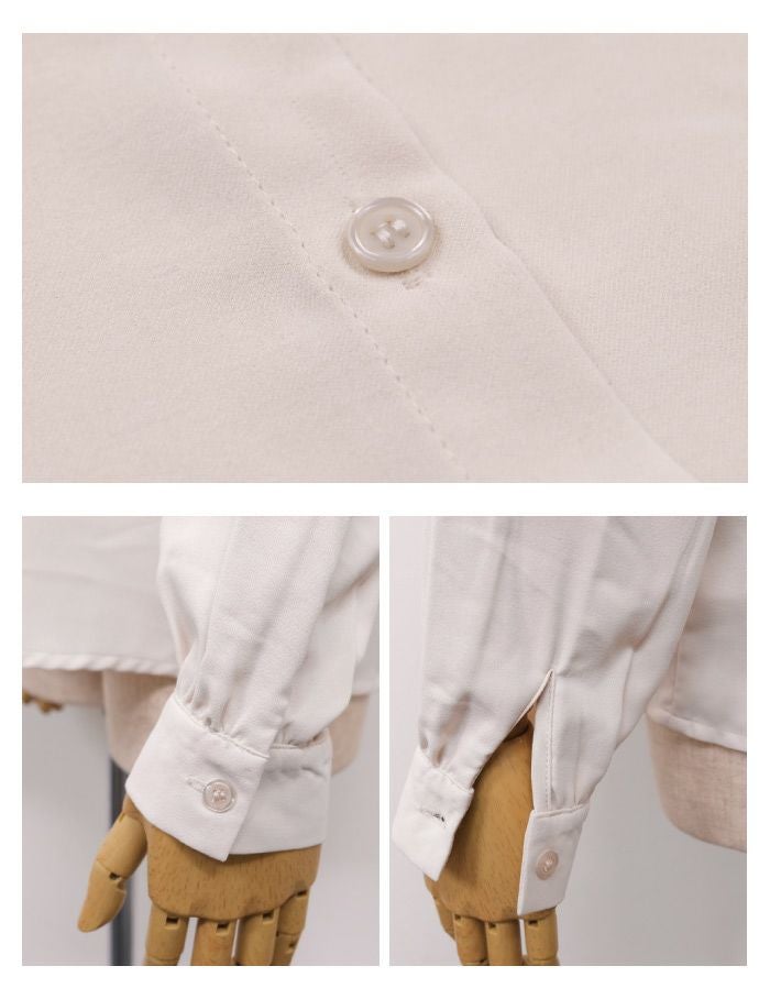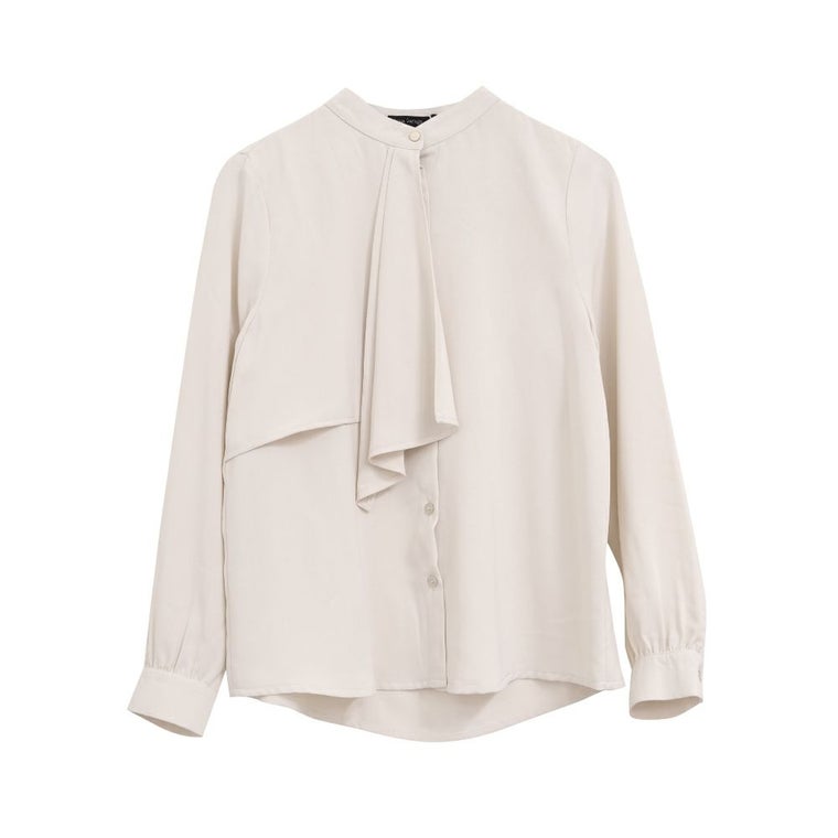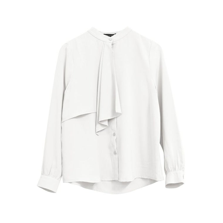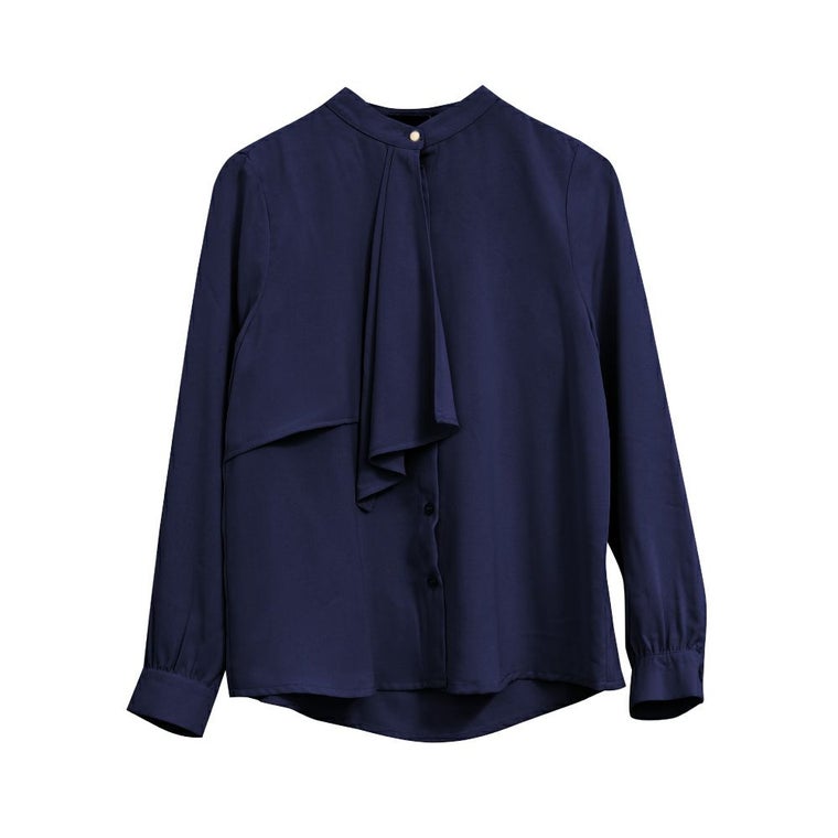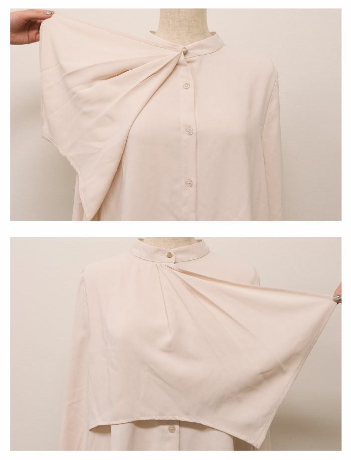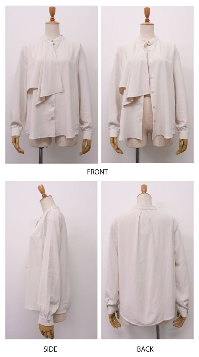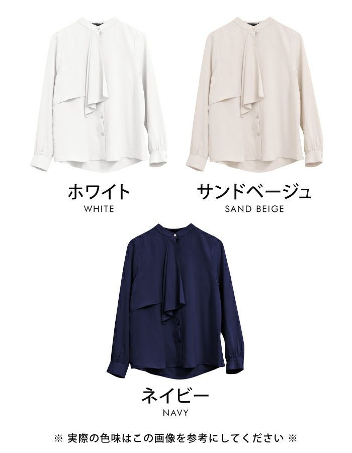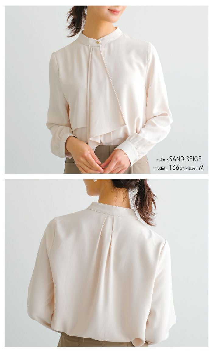 胸元がドレープデザインの着る人を上品に演出するブラウス。 視線が胸元にいくことで縦長効果が得られスマートな印象に◎ スタンドカラーでクラシカルな1枚です。