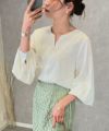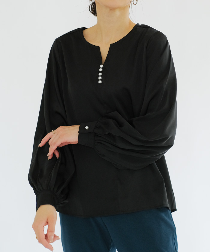 上品見えの浅めキーネックにパールをあしらったブラウス。