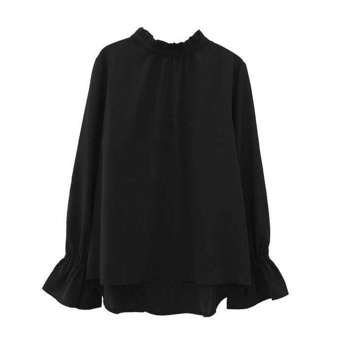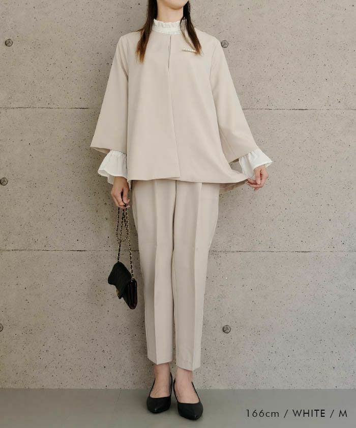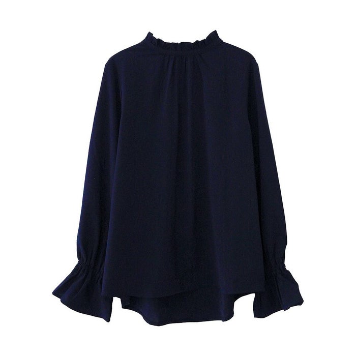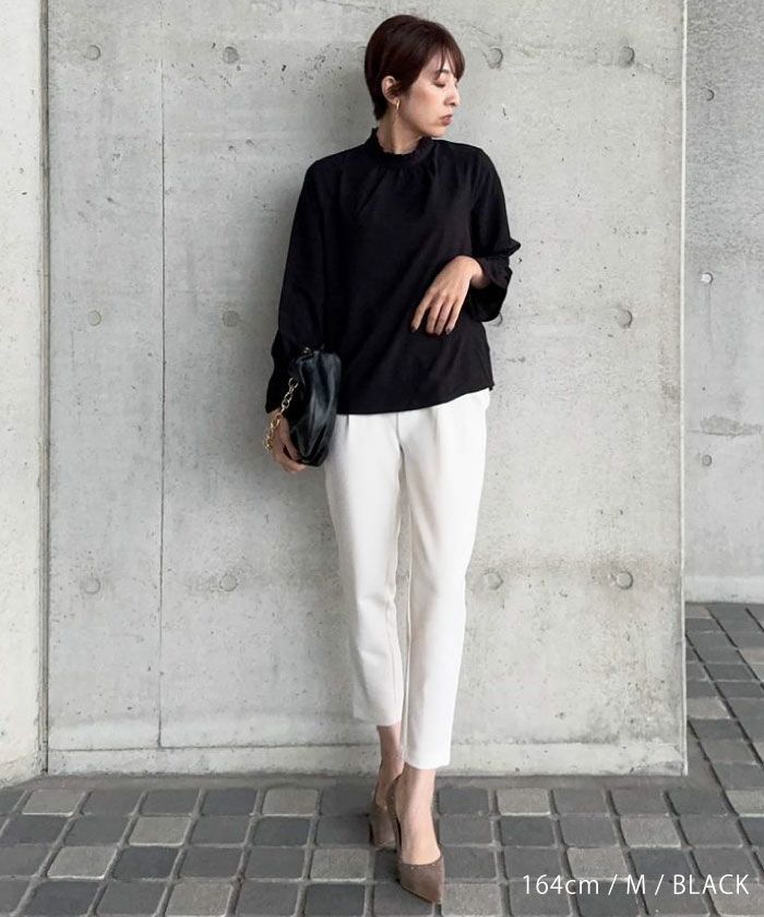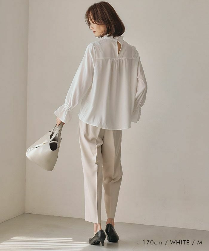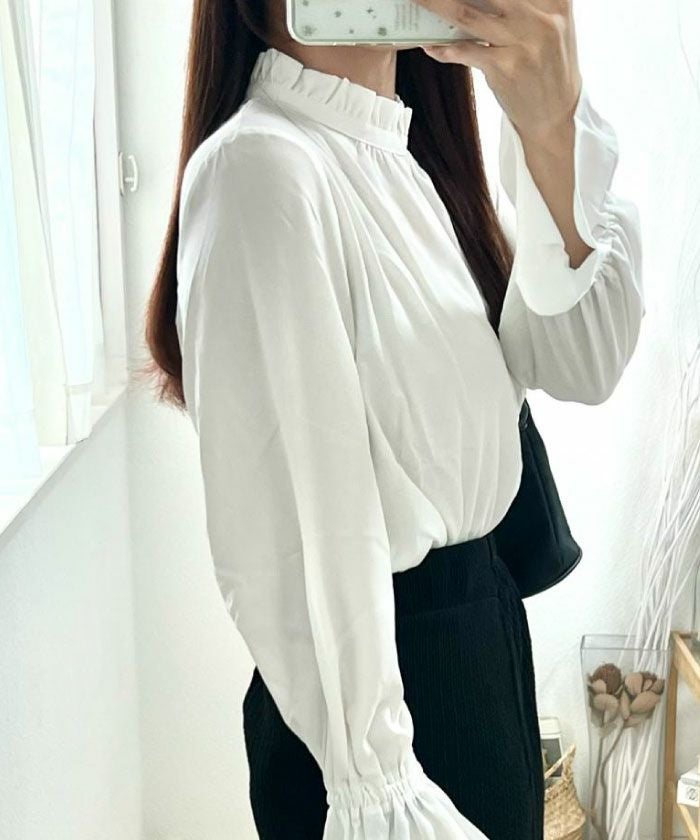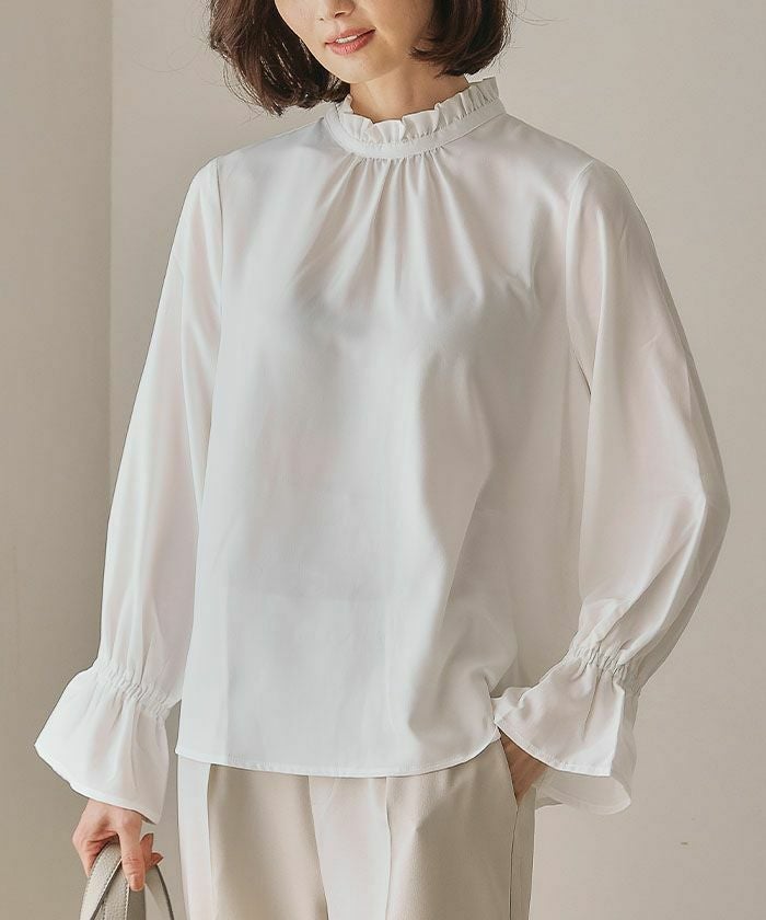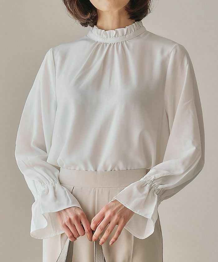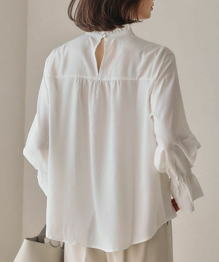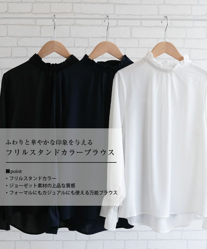 フリルがふわりと華やかな印象を与えるスタンドカラーが魅力の「フリルスタンドカラーブラウス」。