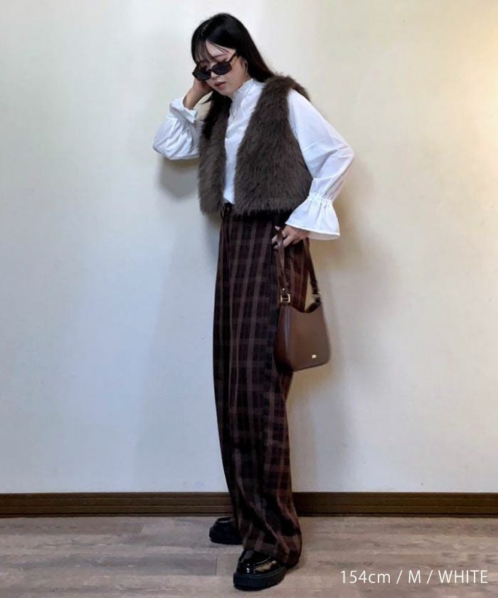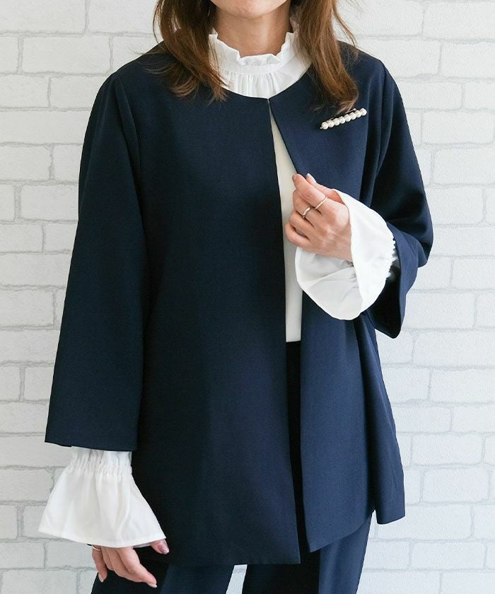 首元のフリルが顔まわりを明るく形づくり、シンプルながら存在感のあるデザインです。