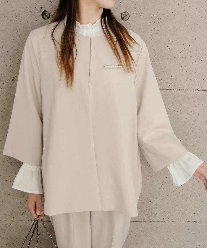 顔まわりのフリルがアクセントになり、レイヤードスタイルに女性らしさを添えてくれます。