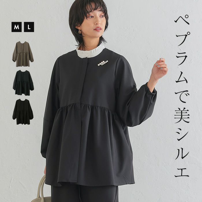 前開きタイプなので着用しやすさをと甘くなりやすいペプラムシルエットもフロント開きで少しシャープな印象に導きます。