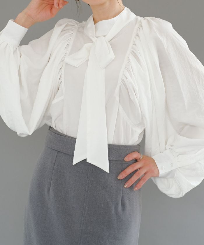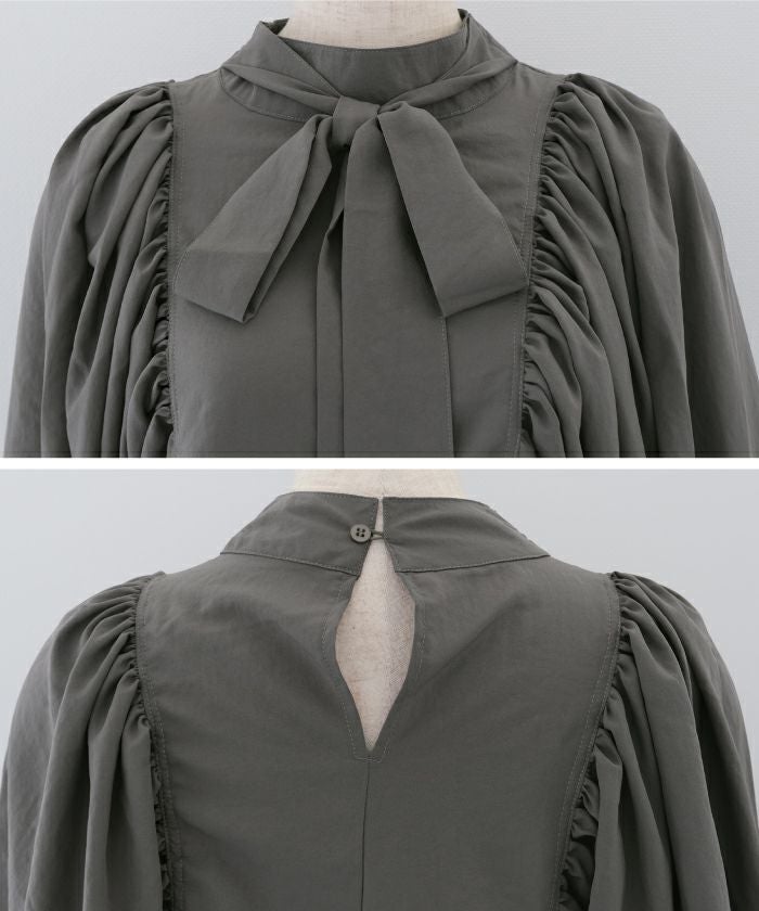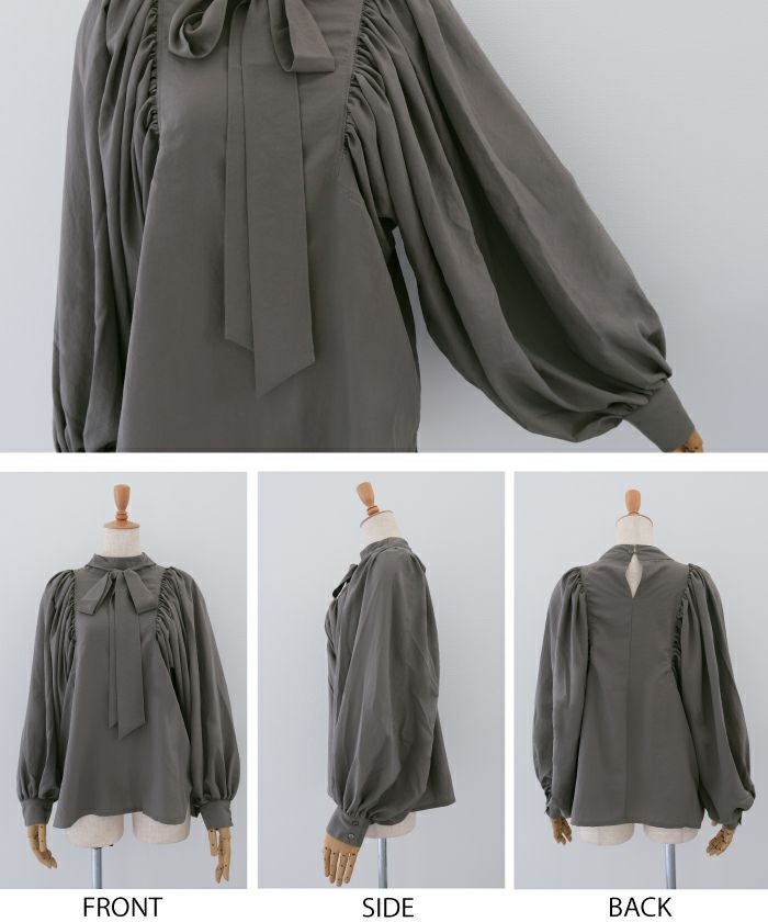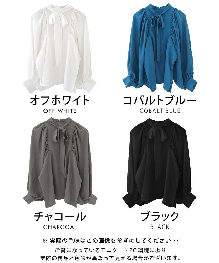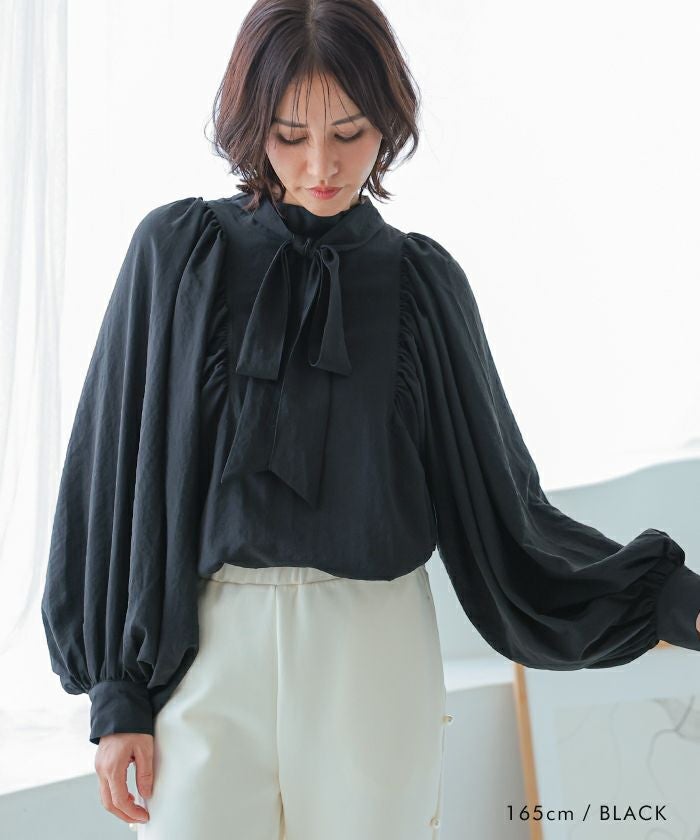 • 大きめのリボンがアクセント!たっぷりギャザーが目を惹く華やかボウタイブラウス