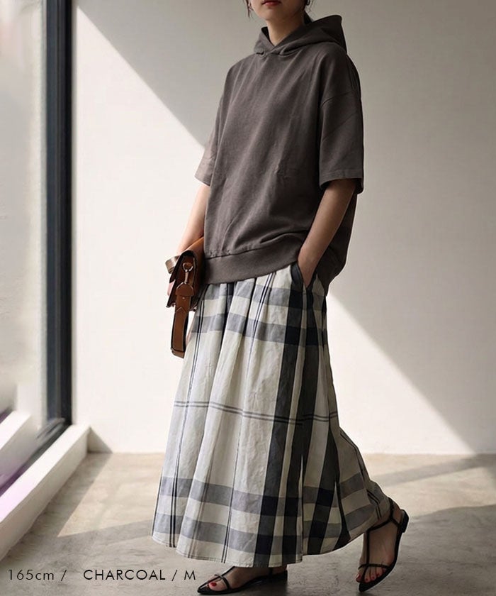 重くなりがちなパーカースタイルも、すっきりとした抜け感のある印象で楽しめます。