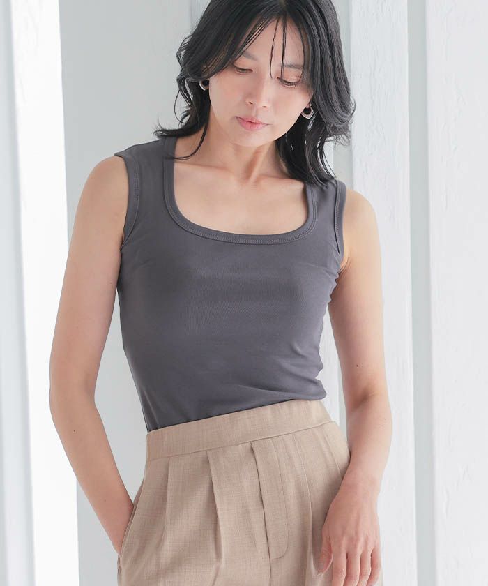 デコルテをきれいに見せるスクエアカットリブニットタンクトップ