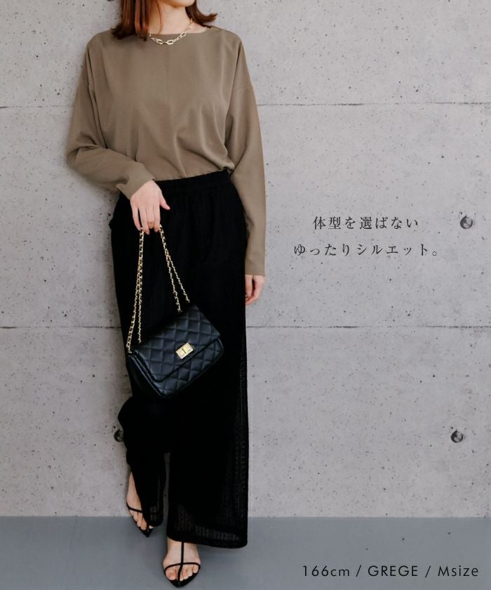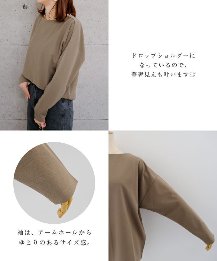 肩が落ちるドロップショルダーと首元をボートネックにすることで