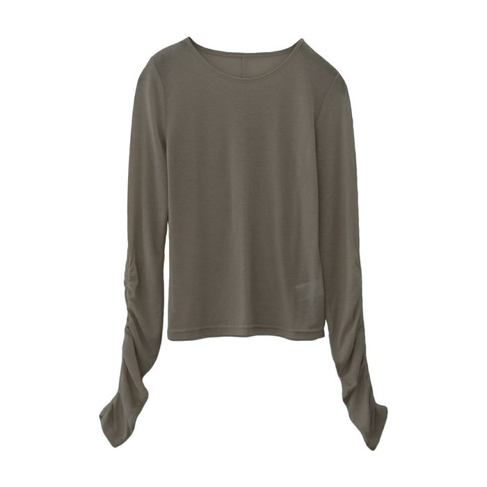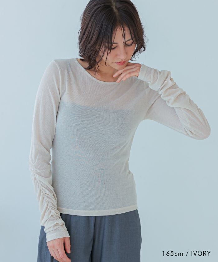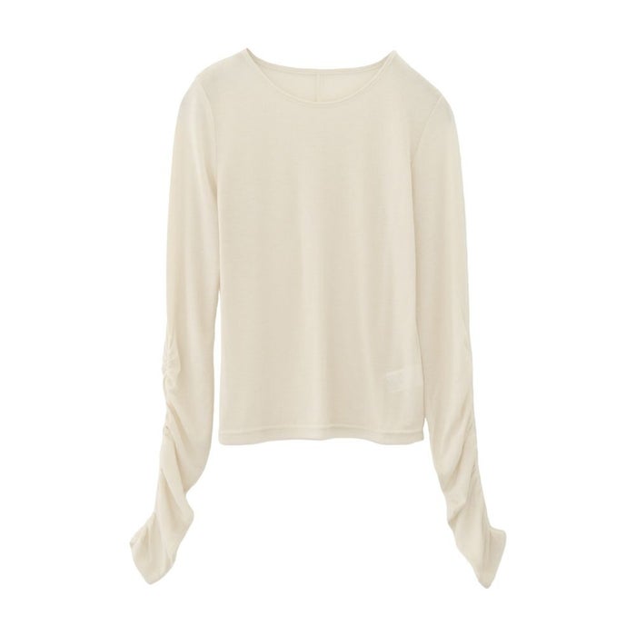 シャーリングデザインのスリーブがポイントになったトップス。
