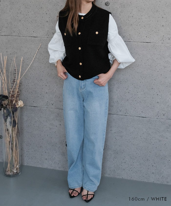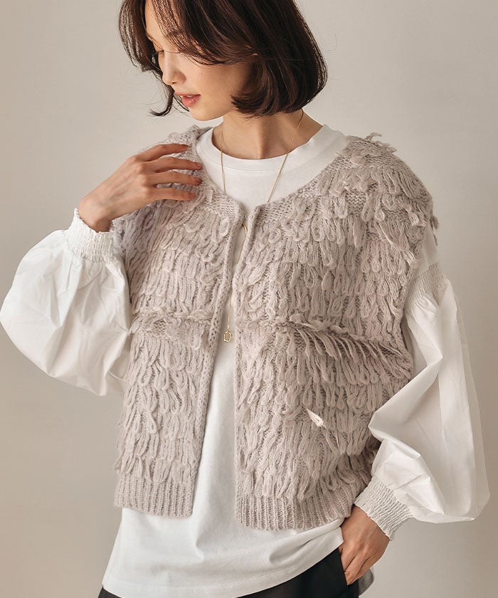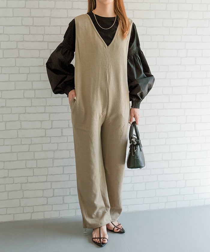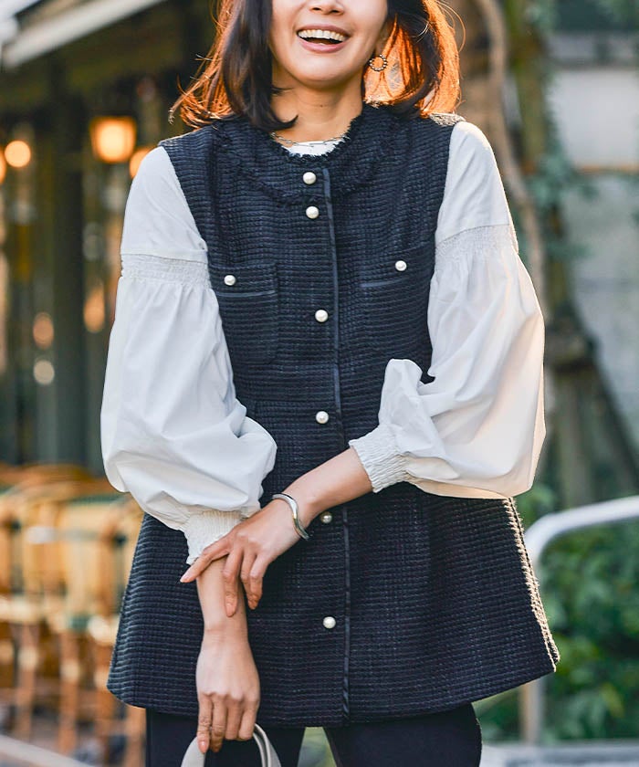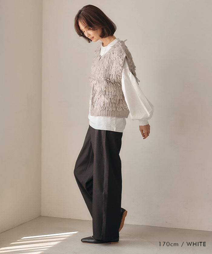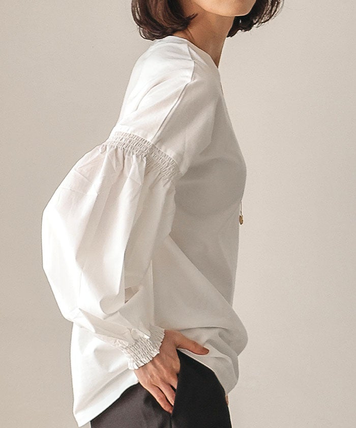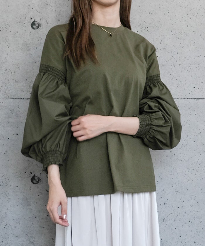 袖のボリュームとドロップショルダーの組み合わせが、肩や二の腕をふんわりカバーしつつ、女性らしさを引き立てます。