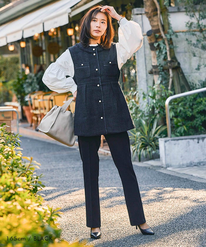 裾はヒップをやさしく隠してくれる丈感なので、パンツにもスカートにも合わせやすく、体型カバーにも一役買ってくれます。