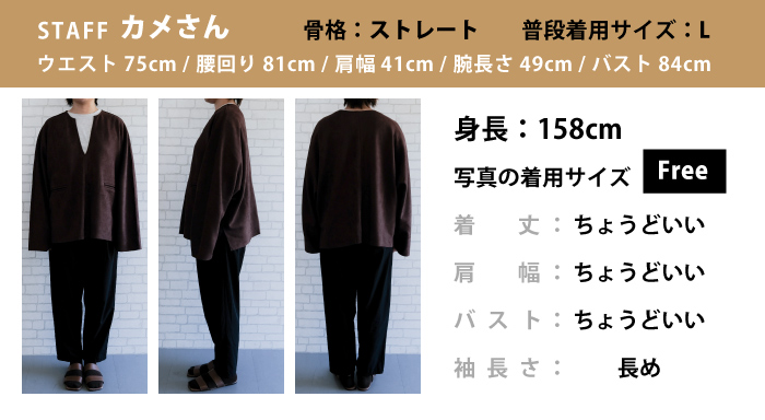 程よい落ち感があり、体に馴染む着心地が魅力です。