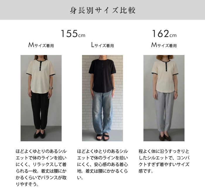 首元はボタン付きのヘンリーデザインで、開け具合によって印象を変えられるのが魅力です。