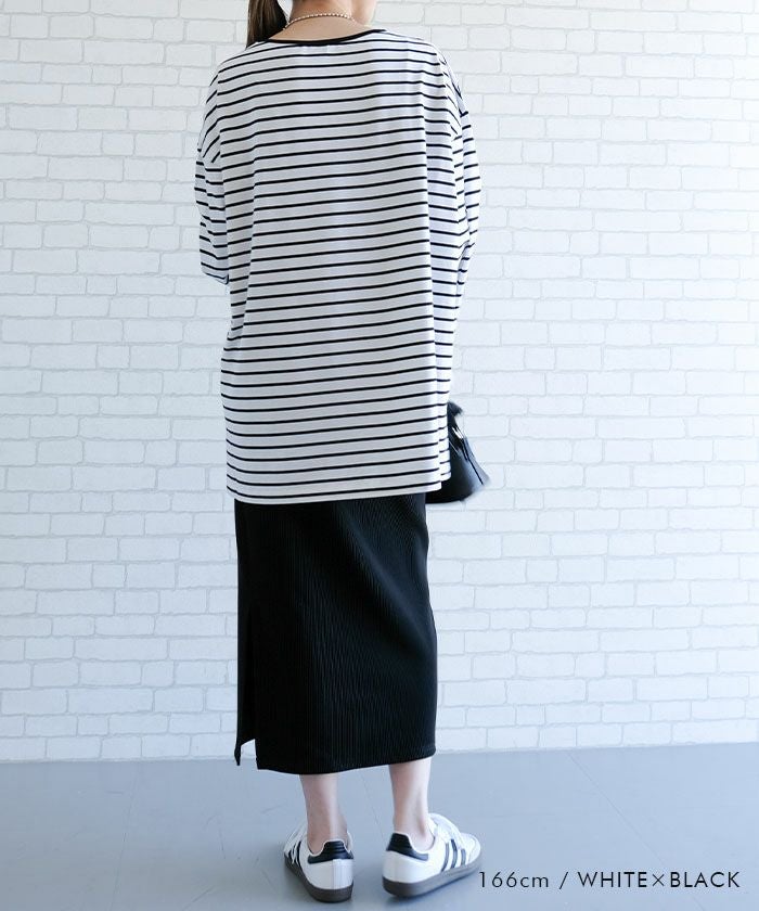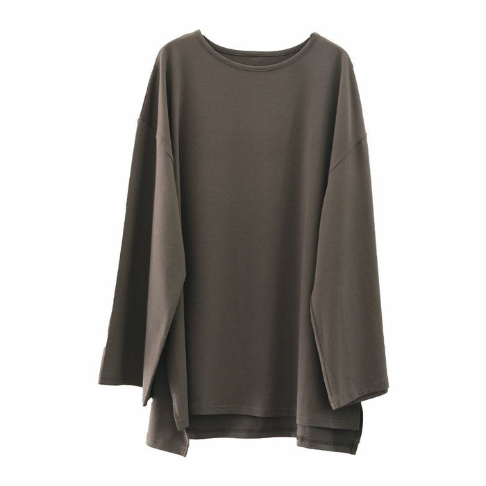 首まわりはすっきりと開きすぎないラウンドネック仕様で、きれいめにもカジュアルにも合わせやすいバランスに仕上げています。