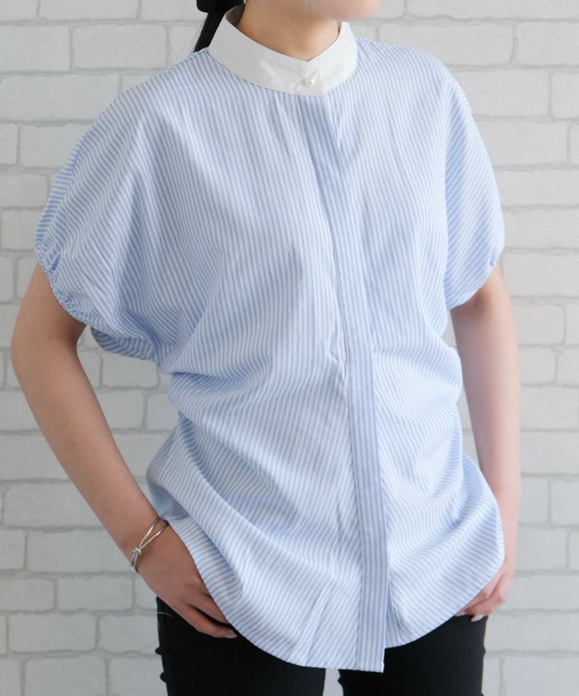 送料無料 シアーバンドカラーシャツ レディース 春 夏 フレンチスリーブ ≪ゆうメール便配送10代引不可≫ | アクアガレージ aquagarage