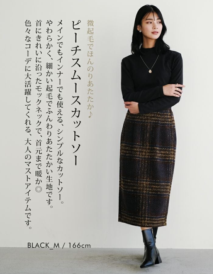 やわらかく、細かい起毛でふんわりあたたかい生地です。 首にきれいに沿ったモックネックで首元まで暖か◎ 色々なコーデに大活躍してくれる、大人のマストアイテムです。