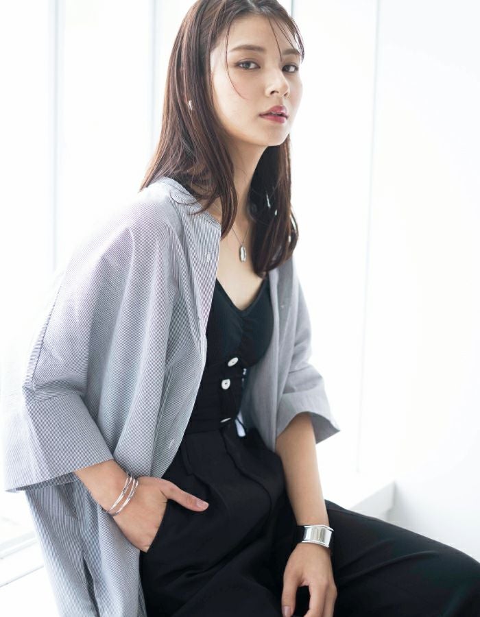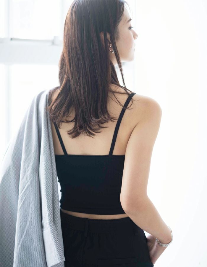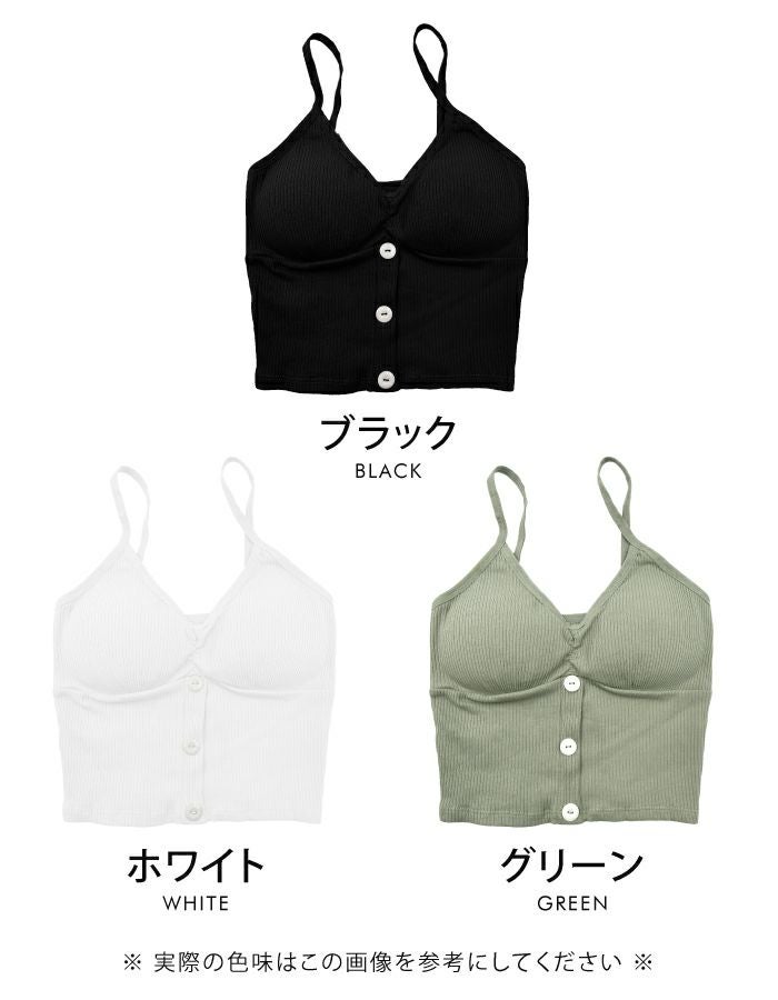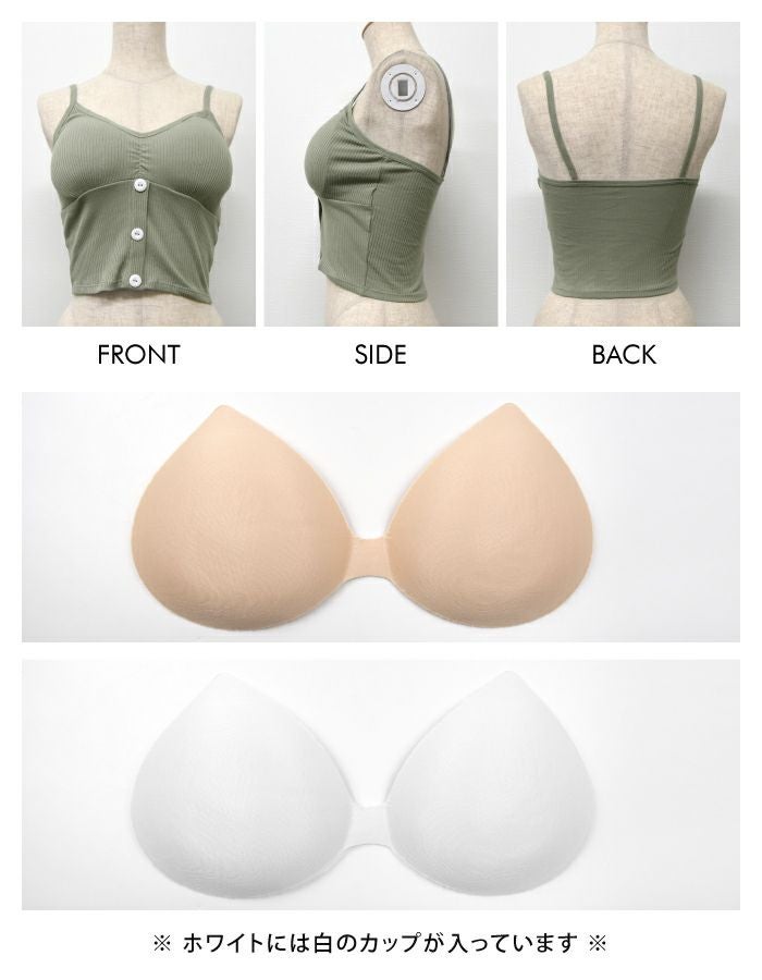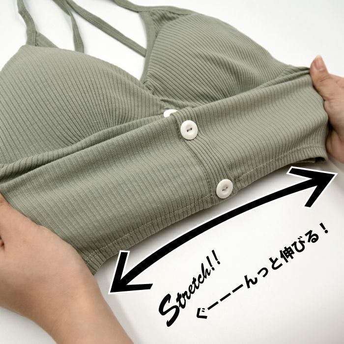 フロントについたボタンが可愛いカップ付きブラトップ。 日中はもちろん、おうち時間やリラックスタイムにも◎ 伸縮性のあるストレッチ素材で安心の着心地です。