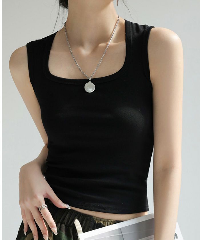 デコルテをきれいに見せるスクエアカットリブニットタンクトップ