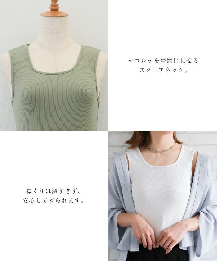スクエアネックは深すぎず、デコルテを綺麗に見せながらも安心して着られます。