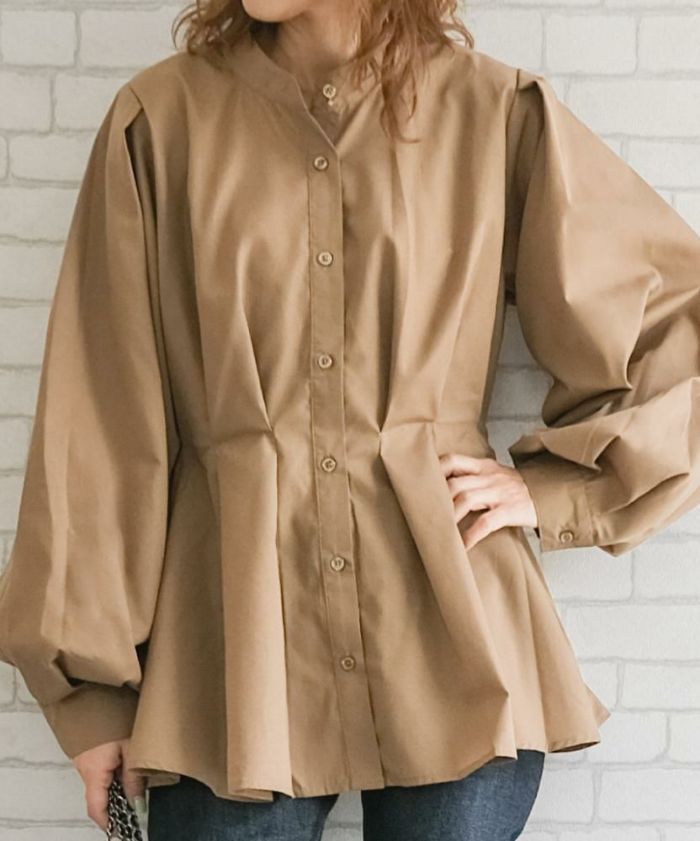 • 女性らしいシルエットを演出するウエストタック長袖ブラウス